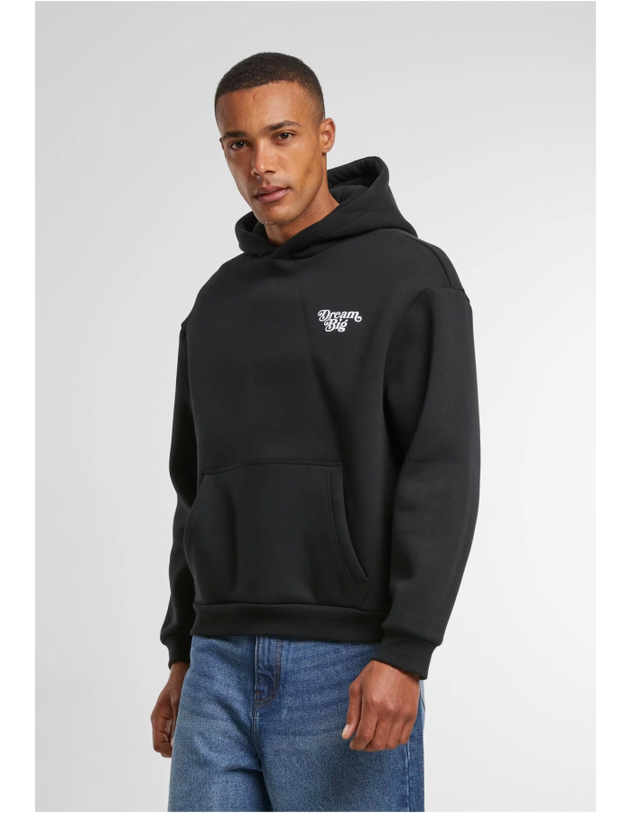 Na přední straně, vlevo nahoře, je malý bílý nápis „Dream Big“ v ozdobném písmu. Mikina má volný střih, dlouhé rukávy a klokaní kapsu. Na zadní straně mikiny je velký bílý nápis „Dream Big“ ve stejném ozdobném písmu jako na přední straně.