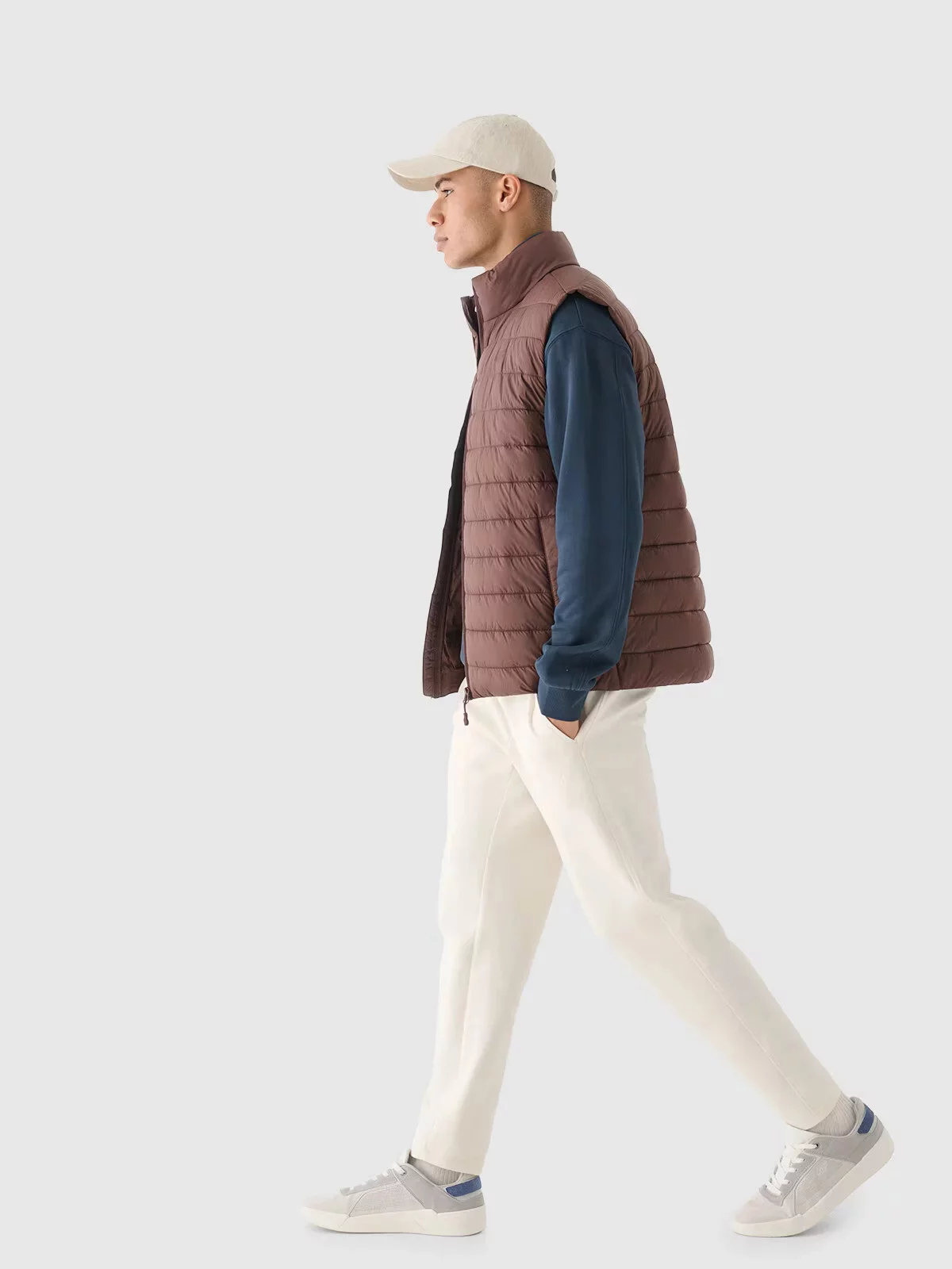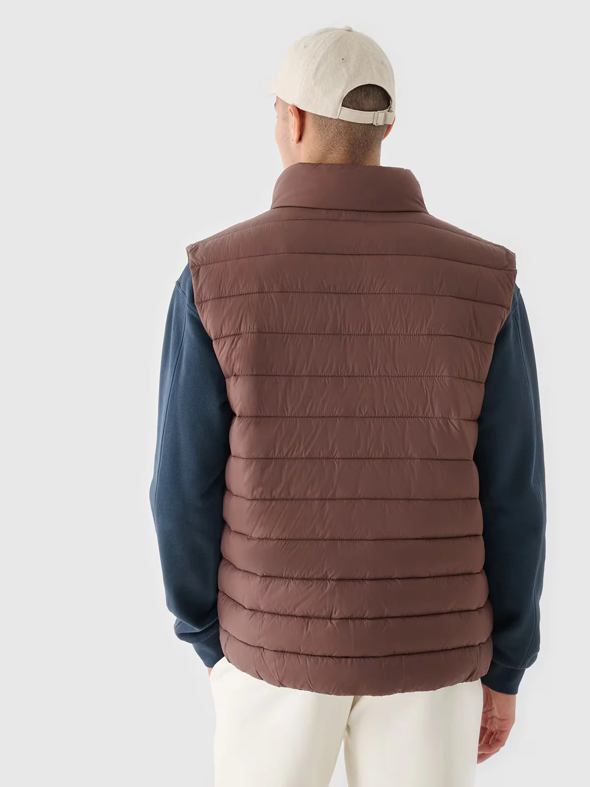 Pánská péřová vesta se stojáčkem a lehkou konstrukcí, díky čemuž ji můžete nosit během každodenních i sportovních aktivit v teplejších dnech v přechodném období.