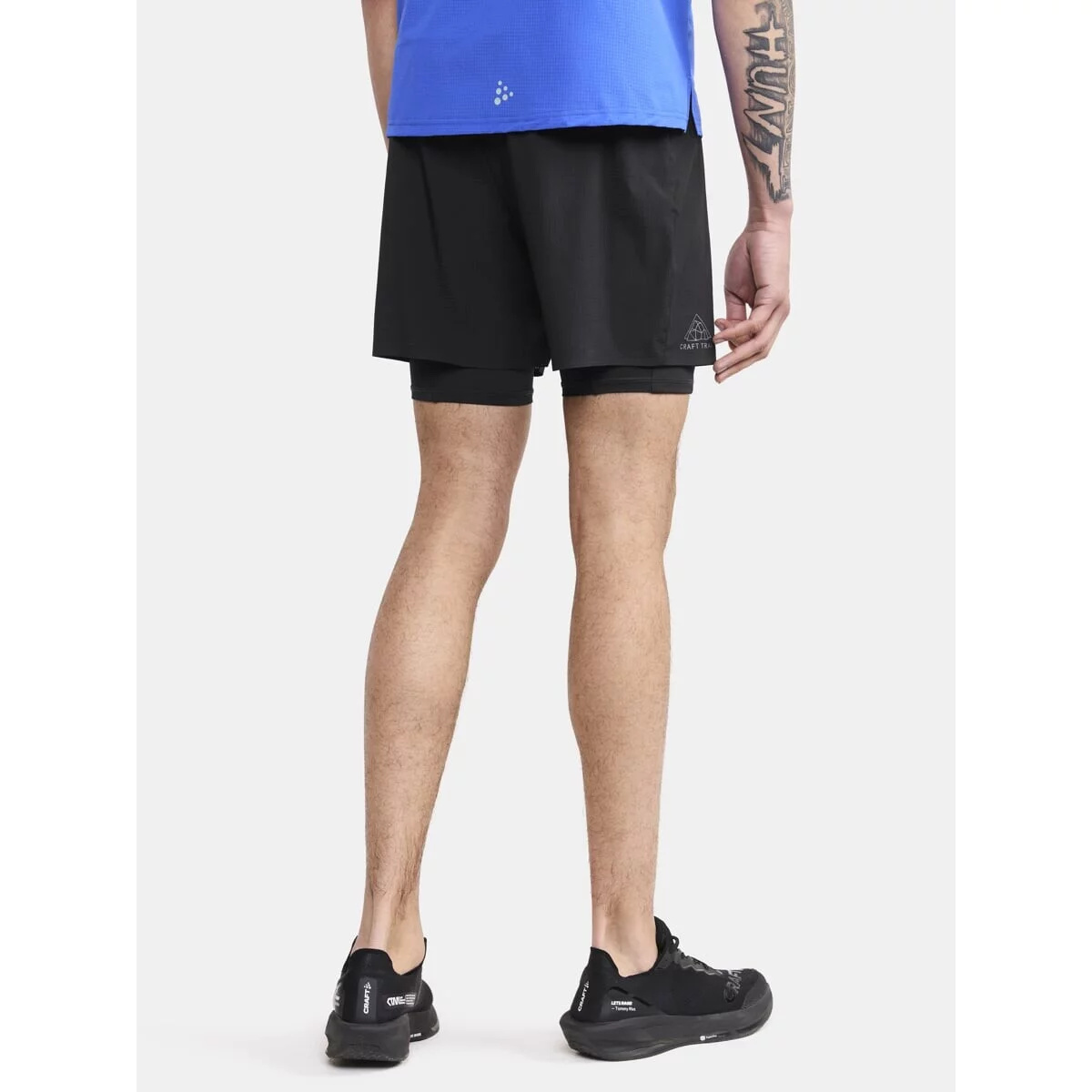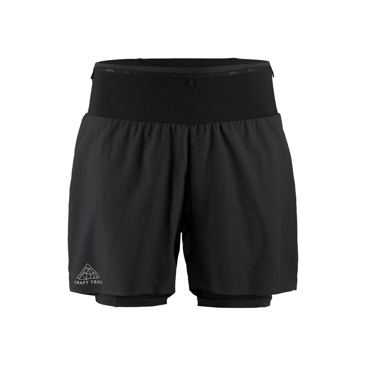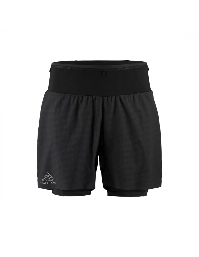 Pánské běžecké kraťasy2 v 1 CRAFT PRO Trail jsou velmi lehké, prodyšné a poskytují spoustu kapes pro uložení výživy nebo jiných drobností.