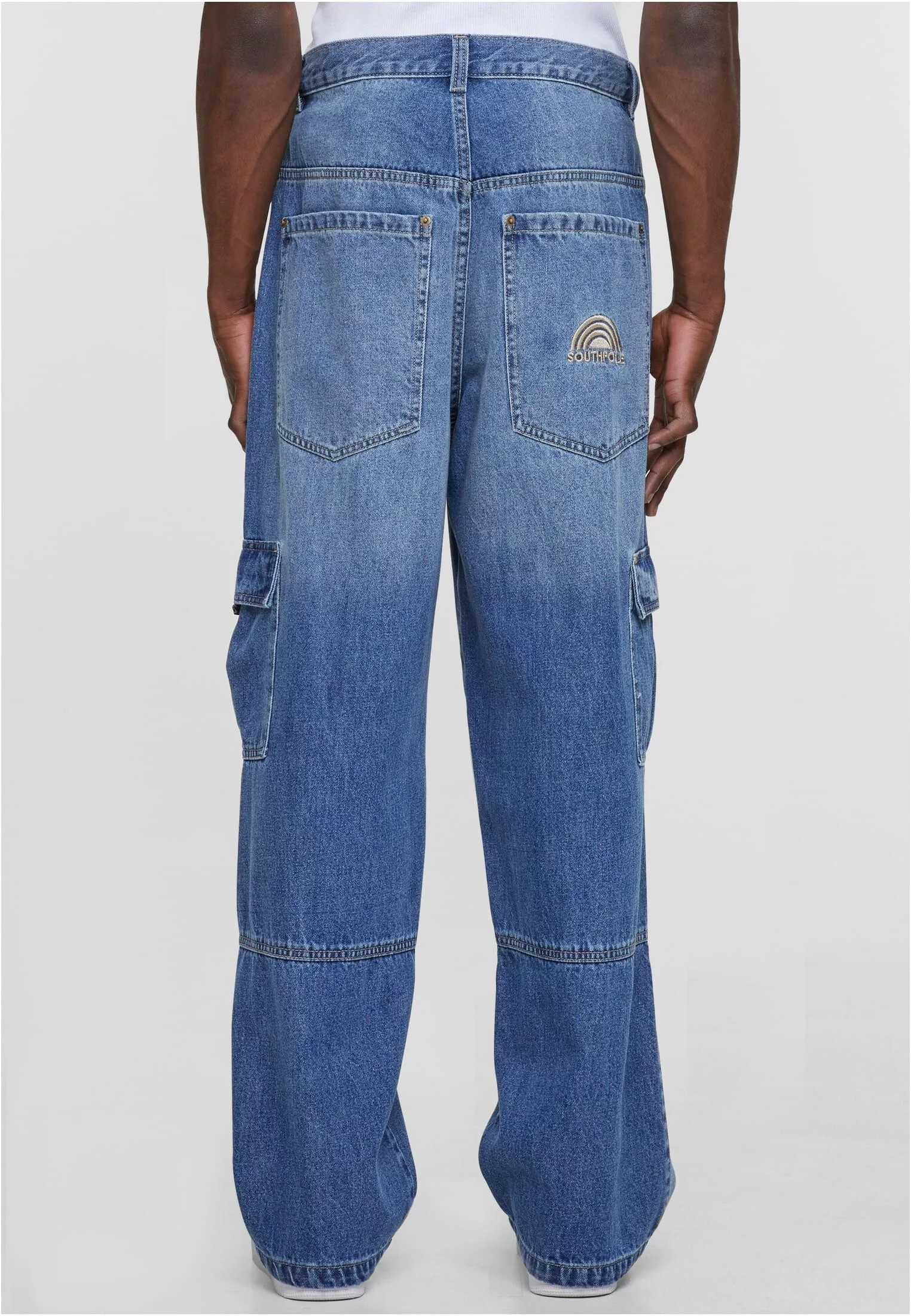 Pánské džínové cargo kalhoty s volným střihem. Kalhoty mají klasické kapsy a další cargo kapsy na bocích, což dodává funkční a ležérní vzhled. Vyrobeny z lehce praného denimu, ideální pro každodenní nošení. Zadní část zdobí výšivka na kapse, která dodává unikátní detail. Perfektní v kombinaci s teniskami a tričkem pro pohodlný, moderní styl.