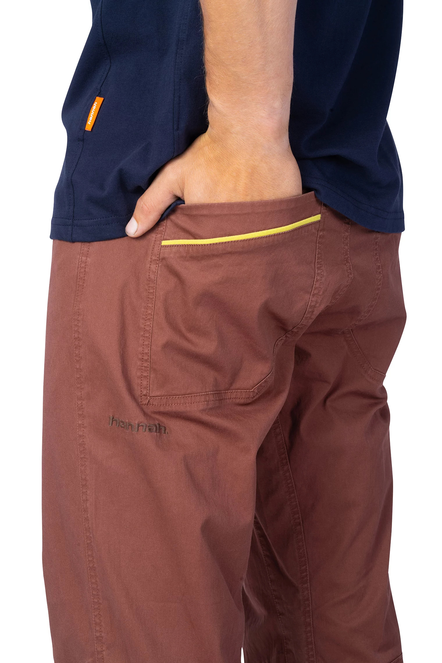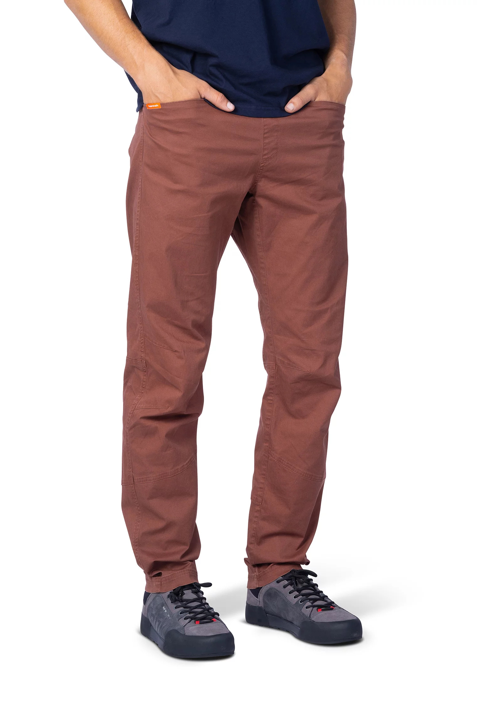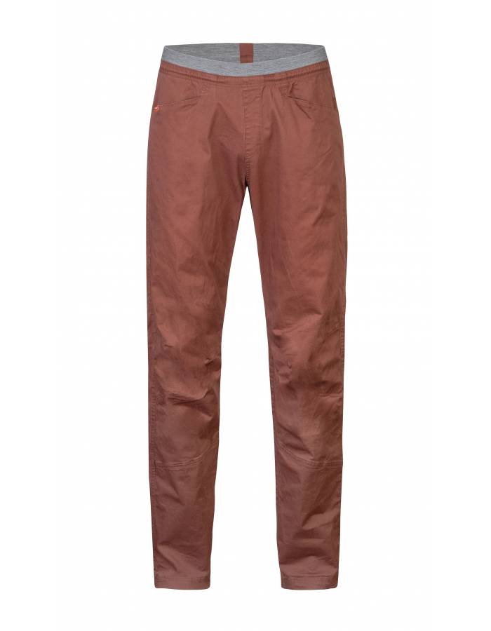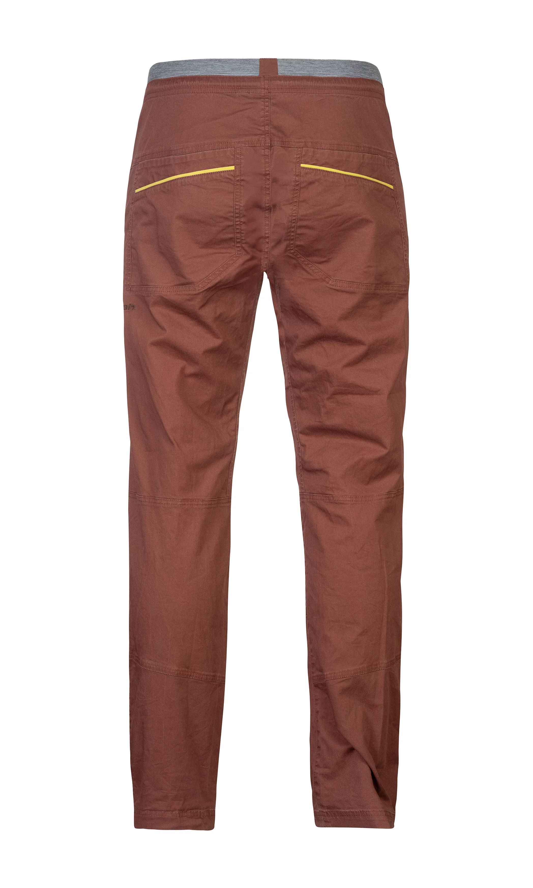Pánské bavlněné kalhoty technického střihu s anatomicky tvarovanými koleny poskytují volnost pohybu a flexibilitu. Kalhoty jsou vyrobeny z kvalitní bavlny, která je prodyšná a příjemná na dotek, příměs elastanu dodává kalhotům poddajnost. Pas do gumy s regulací na šňůrku umožňuje individuální přizpůsobení a pohodlí během nošení. Kalhoty disponují dvěma rovně šitými kapsami v přední i v zadní části. Designovým prvkem jsou printované vnitřní kapsy. Díky svému univerzálnímu designu jsou kalhoty určené nejen pod skálu a do přírody, ale i pro každodenní nošení.