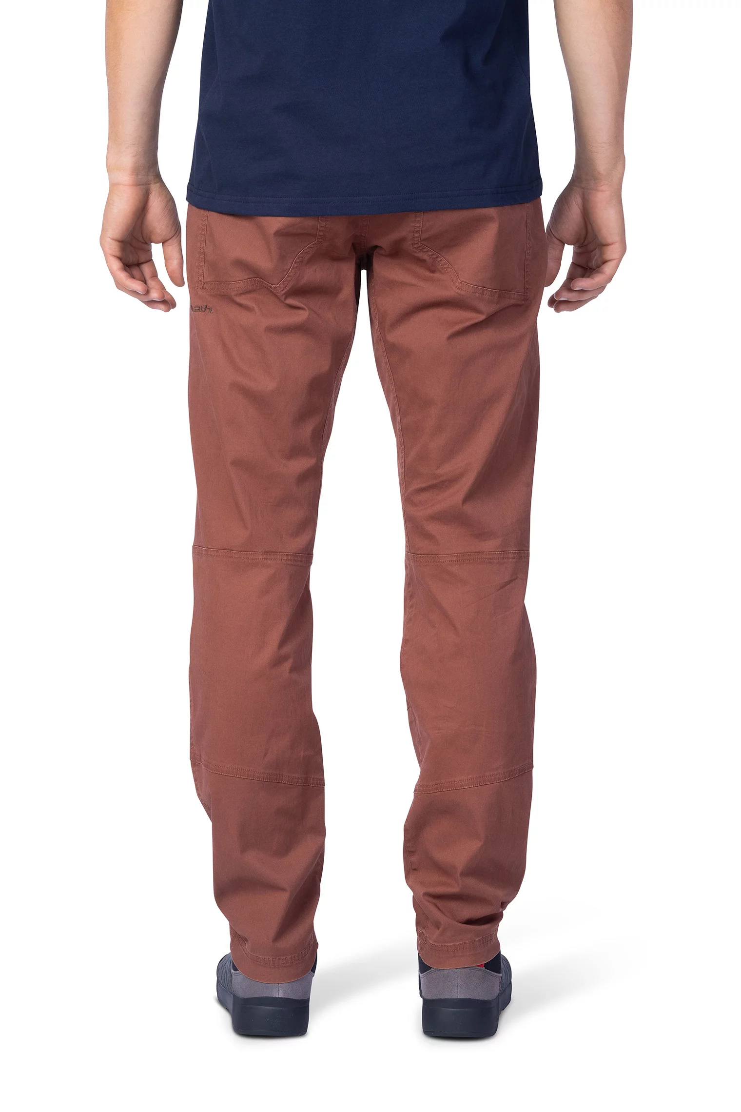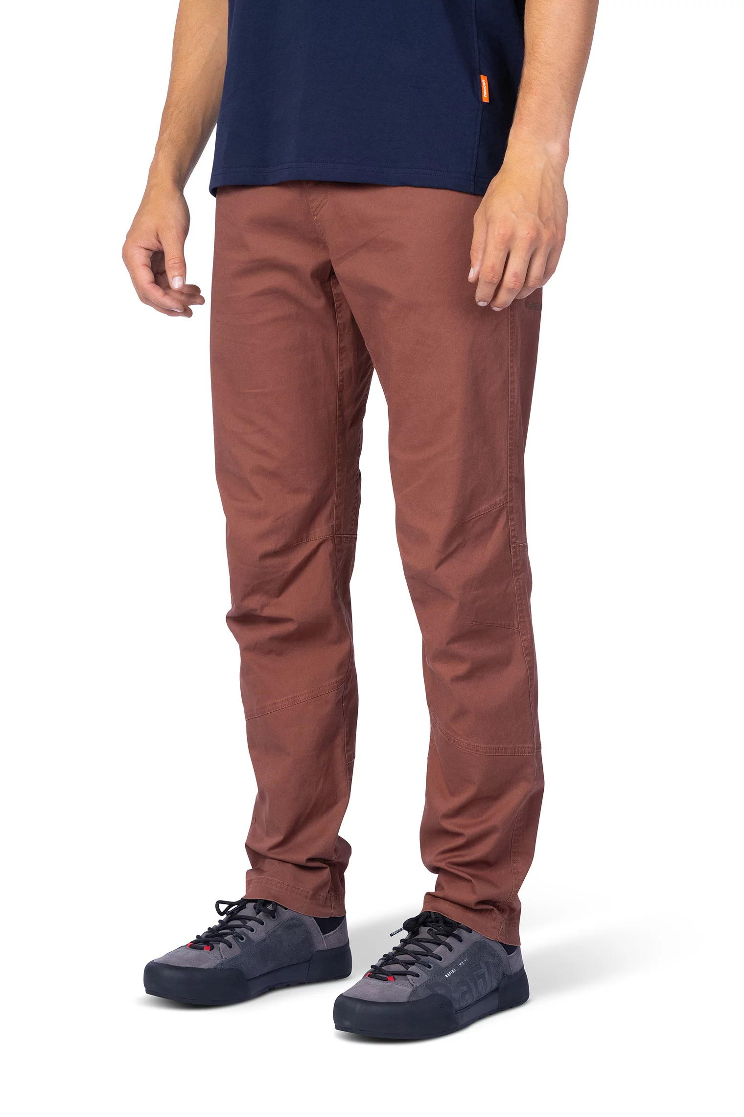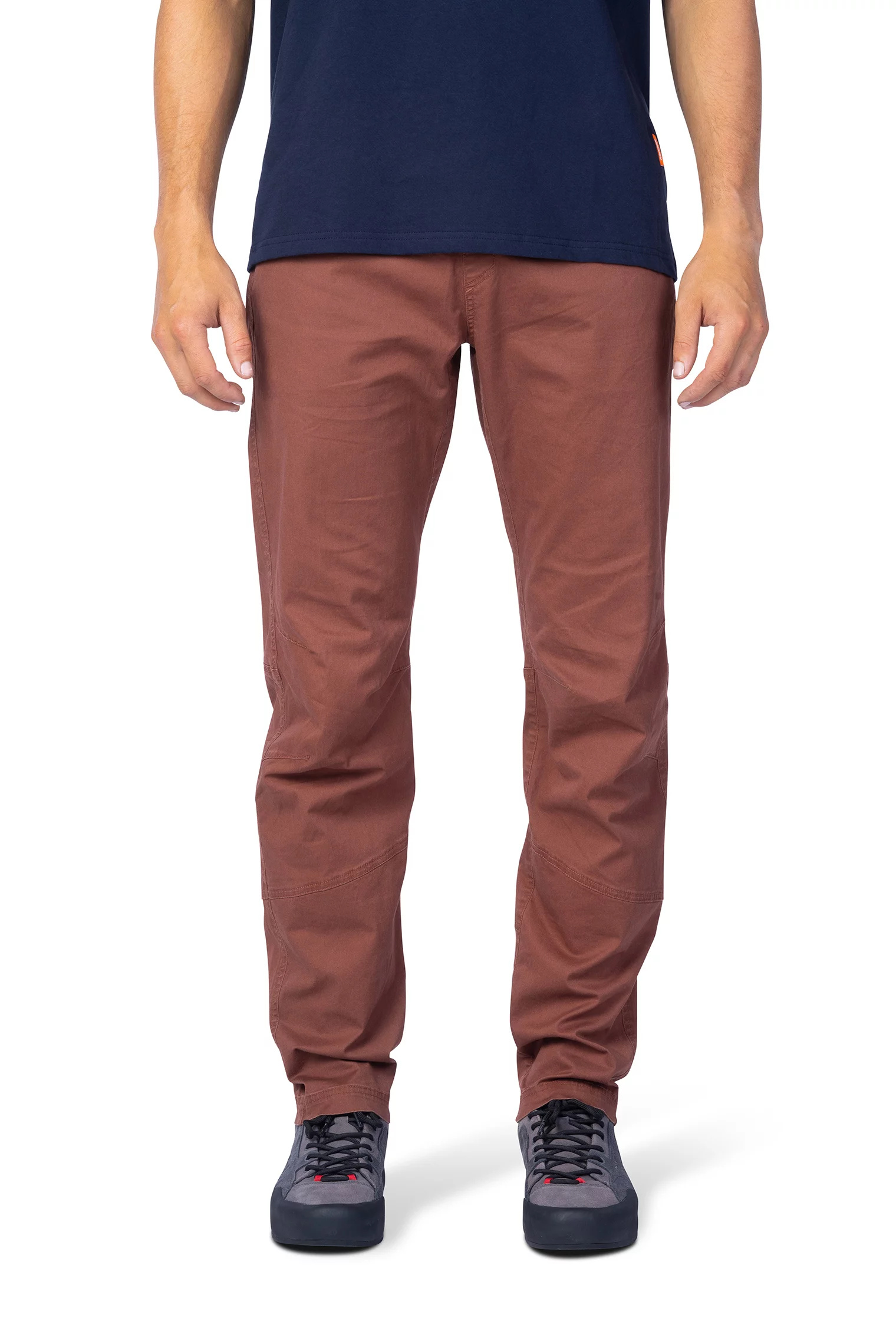 Pánské bavlněné kalhoty technického střihu s anatomicky tvarovanými koleny poskytují volnost pohybu a flexibilitu. Kalhoty jsou vyrobeny z kvalitní bavlny, která je prodyšná a příjemná na dotek, příměs elastanu dodává kalhotům poddajnost. Pas do gumy s regulací na šňůrku umožňuje individuální přizpůsobení a pohodlí během nošení. Kalhoty disponují dvěma rovně šitými kapsami v přední i v zadní části. Designovým prvkem jsou printované vnitřní kapsy. Díky svému univerzálnímu designu jsou kalhoty určené nejen pod skálu a do přírody, ale i pro každodenní nošení.