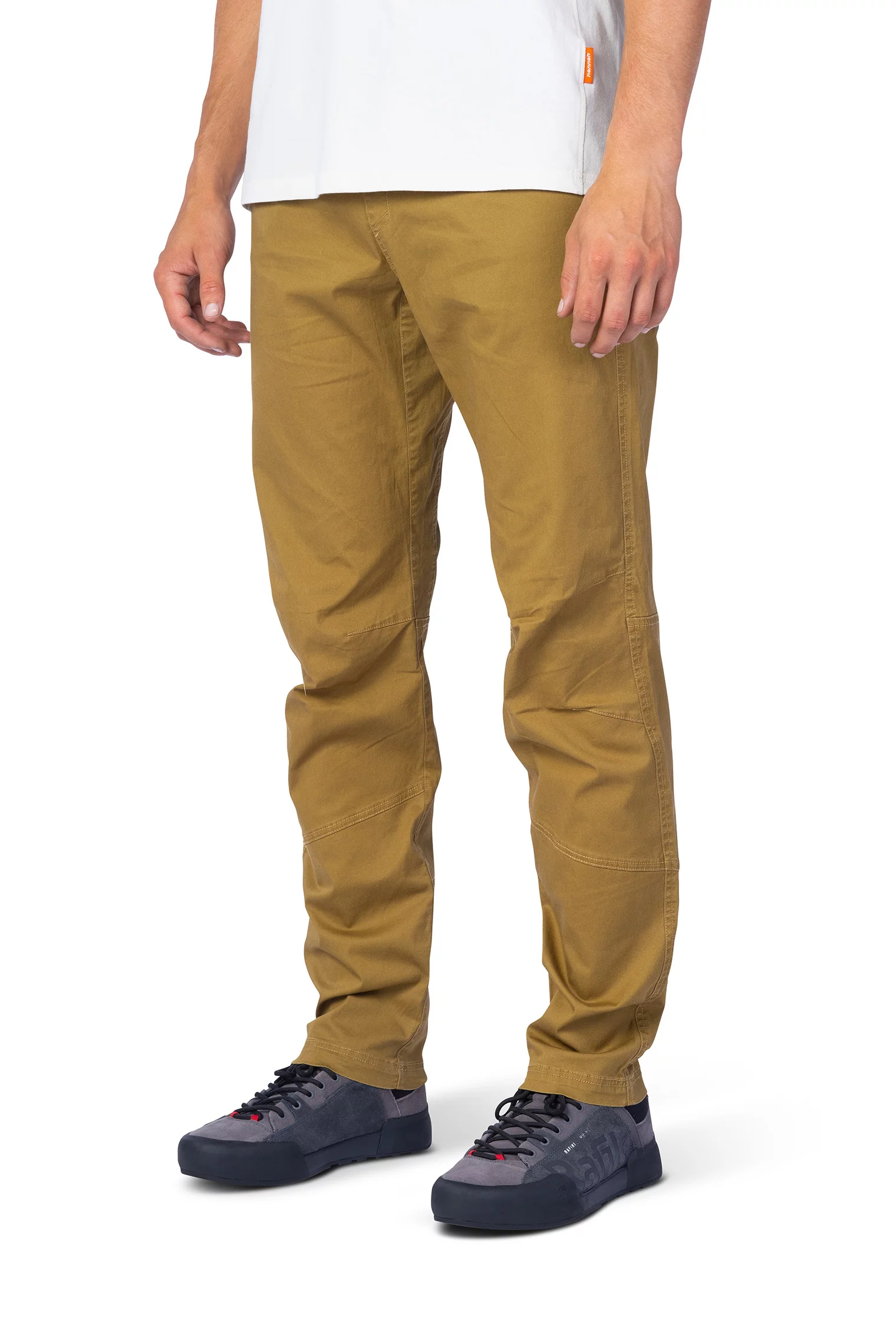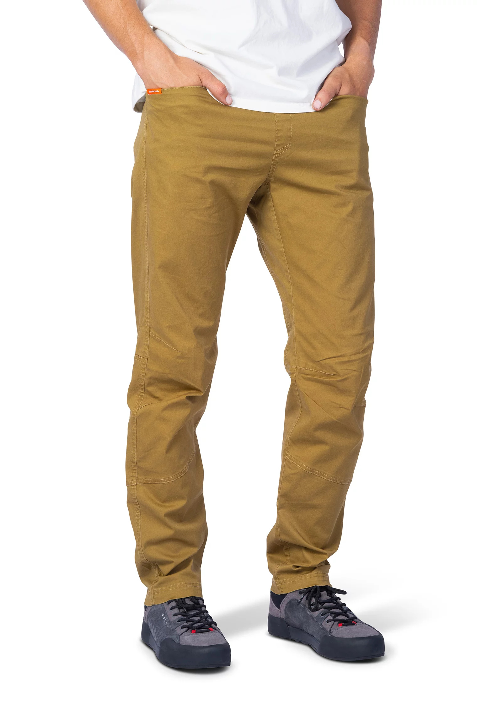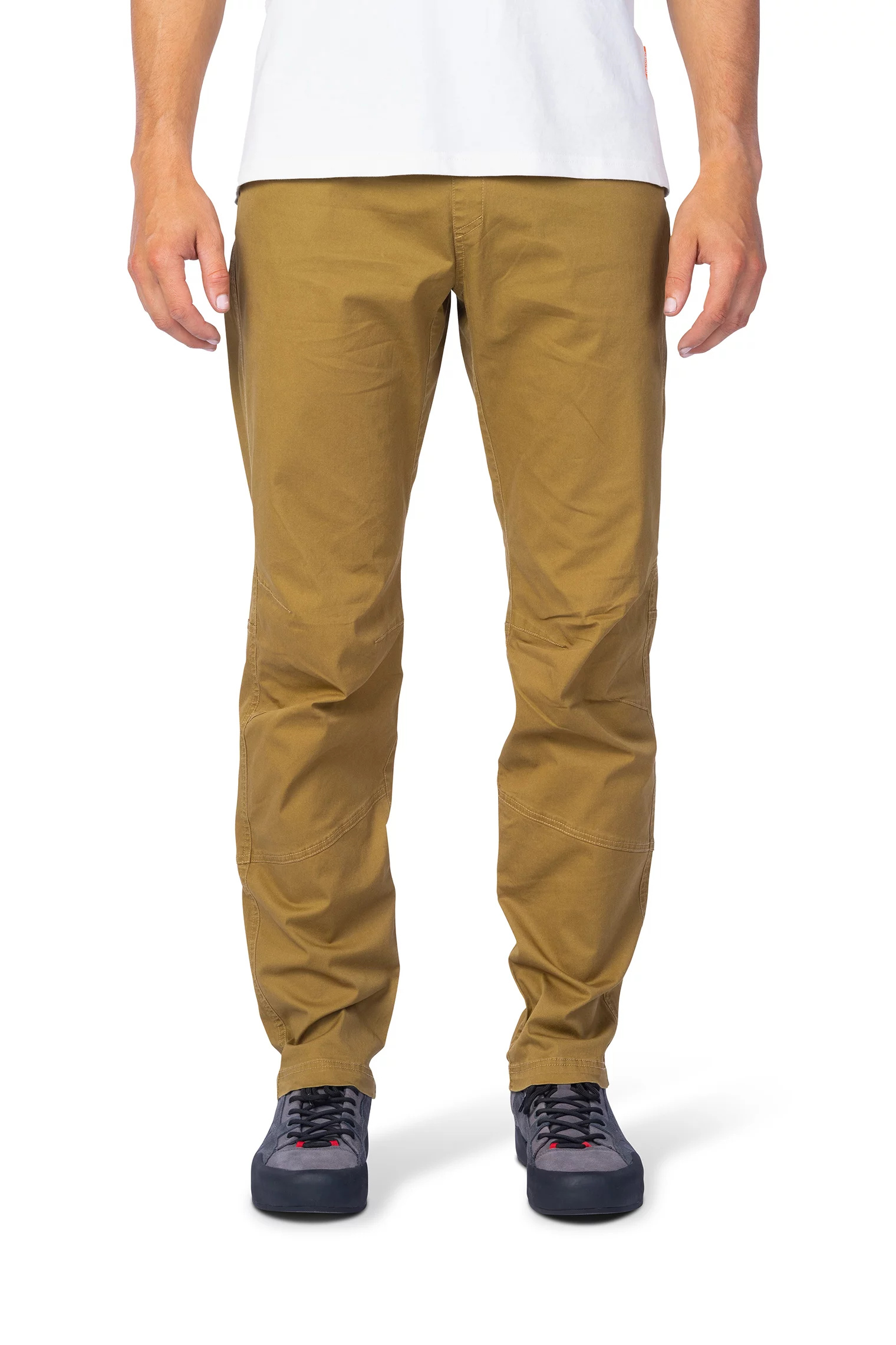 Pánské bavlněné kalhoty technického střihu s anatomicky tvarovanými koleny poskytují volnost pohybu a flexibilitu. Kalhoty jsou vyrobeny z kvalitní bavlny, která je prodyšná a příjemná na dotek, příměs elastanu dodává kalhotům poddajnost. Pas do gumy s regulací na šňůrku umožňuje individuální přizpůsobení a pohodlí během nošení. Kalhoty disponují dvěma rovně šitými kapsami v přední i v zadní části. Designovým prvkem jsou printované vnitřní kapsy. Díky svému univerzálnímu designu jsou kalhoty určené nejen pod skálu a do přírody, ale i pro každodenní nošení.