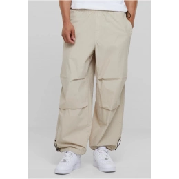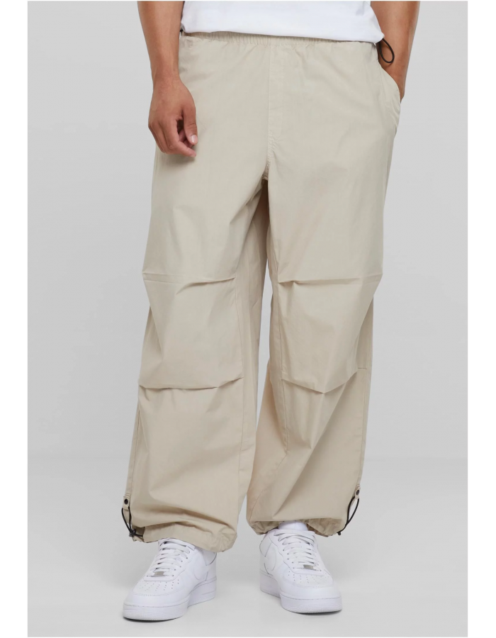 Pánské padákové kalhoty nabízejí široké nohavice se stahovacími šňůrkami se zarážkou v pase a manžetami, které rovněž umožňují individuální přizpůsobení. Dvě boční kapsy s falešnými klopami a záplatovaná kapsa na zadní straně s akcenty, stejně jako s falešnou poklopci. Složená kolena zase vytvoří ještě větší šířku. Padákové kalhoty jsou vyrobeny z hladkého bavlněného popelínu.