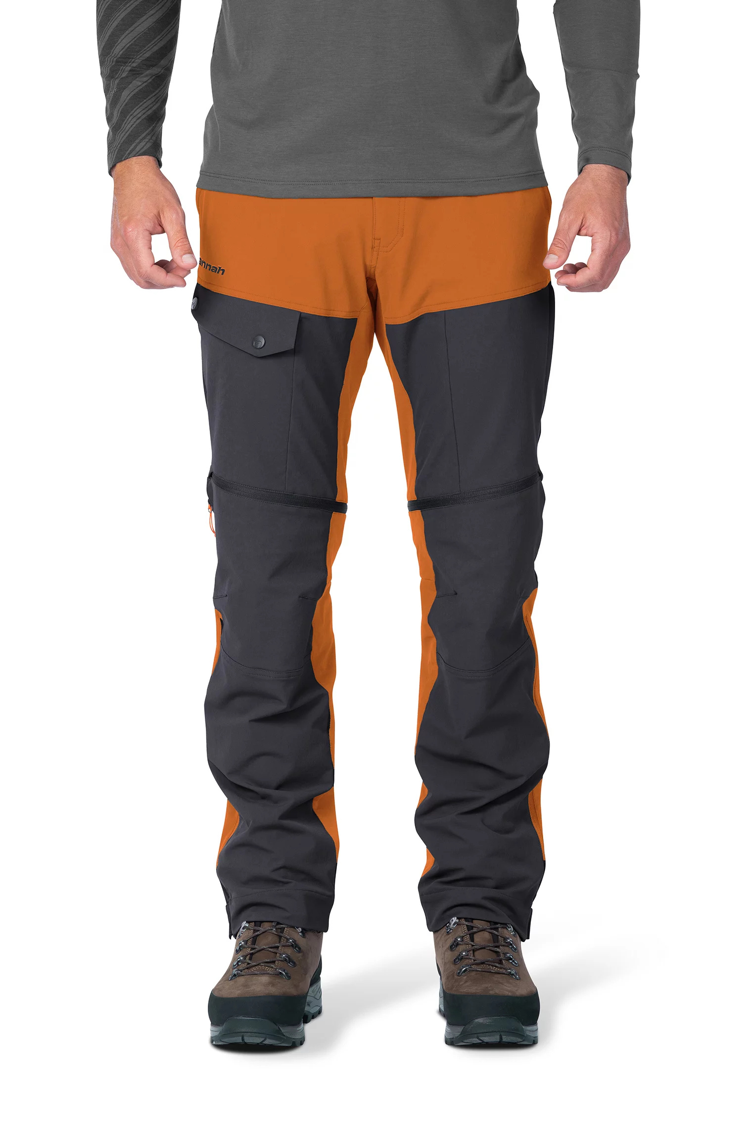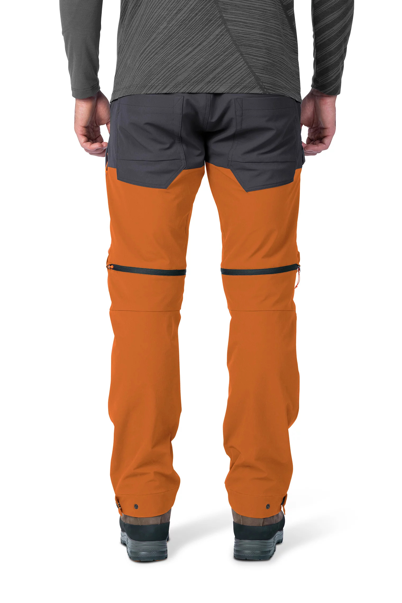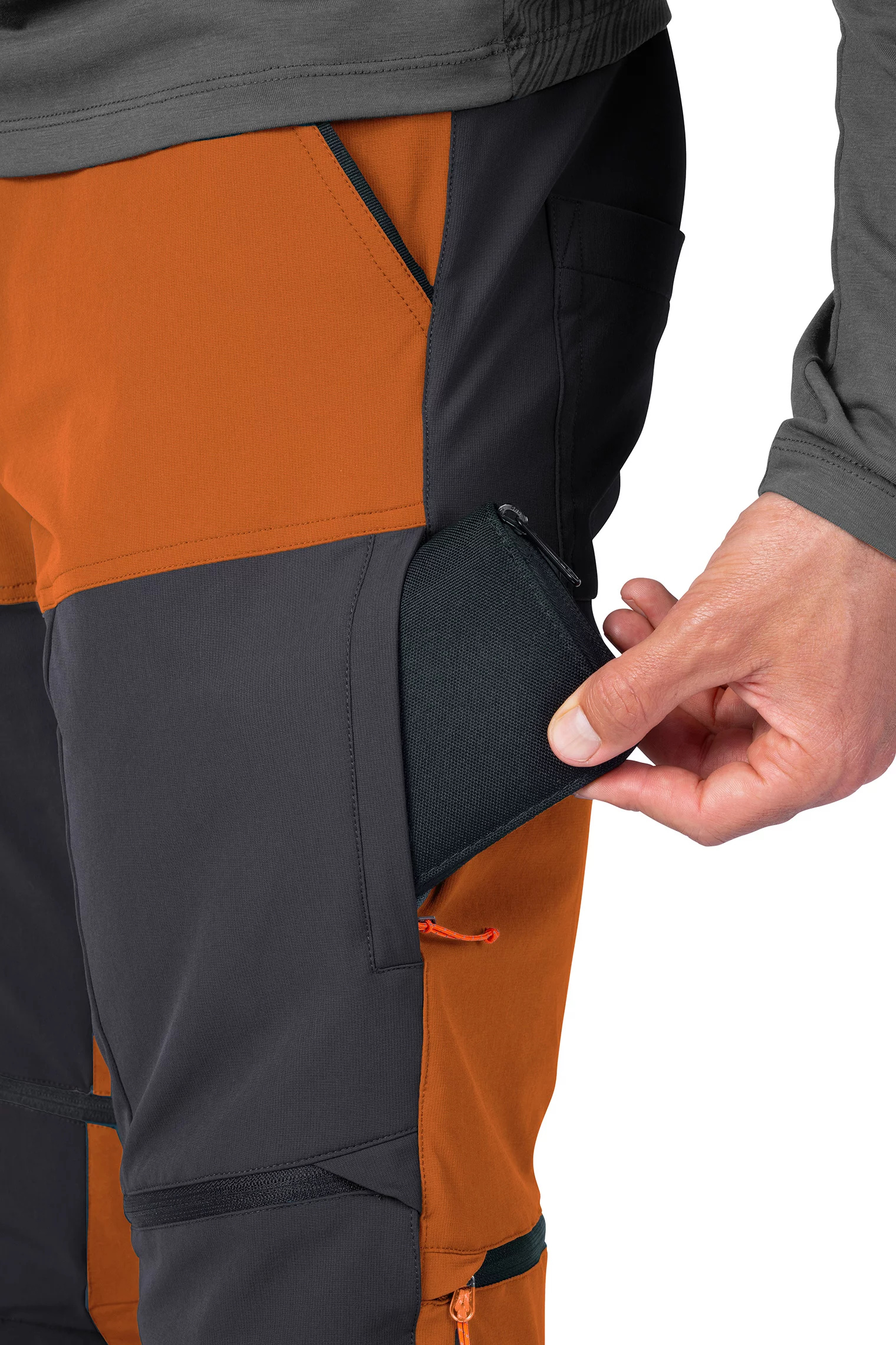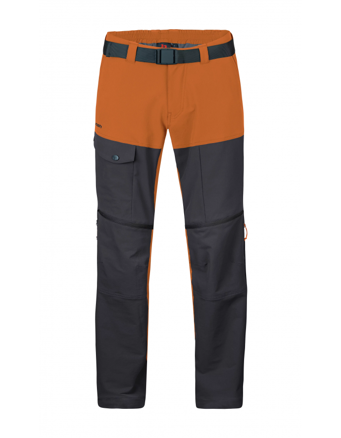 Pánské odepínatelné technické outdoorové kalhoty jsou vyrobeny z mechanicky odolného, větruvzdorného, trvale vodoodpudivého a prodyšného materiálu AFT Double Weave Pro. Povrchová úprava DWR - C0 bez PFC je šetrnější k životnímu prostředí a zajistí nenasákavost vrchního materiálu. Technický střih kalhot má šikmo řešené odepínatelné nohavice s bočním rozepínáním na zip. Odepnutím nohavic jsou z kalhot rázem parádní šortky s délkou lehce nad kolena. Šortky přesahují zip, což zamezuje případnému škrábání zipu. Nohavice mají anatomicky tvarovaná kolena a spodní kraj s regulací šířky na patent, který se přizpůsobí různé botě a potřebám. Kalhoty mají regulovatelnýobvod pasu páskem a disponují kombinací různých typů kapes v přední i zadní části kalhot. V přední části jsou dvě dostatečně hluboké a pohodlné kapsy, na stehnech dvě kapsy na zip. V zadní části pak kalhoty disponují dvěma níže posazenými hlubokými kapsami, které kromě praktické funkce mají i funkci designovou. Nový materiál AFT Double Weave Pro klade kromě již zmíněných technických parametrů důraz na aspekt udržitelné výroby. Materiál je navíc ošetřen povrchovou vodoodpudivou úpravou, která je bez fluorkarbonů, a tím je šetrnější k životnímu prostředí (PFC free). Certifikace Bluesign je zárukou transparentnosti a využití zdrojů šetrných k životnímu prostředí při výrobě. Kalhoty jsou ideální na vícedenní turistiku a náročný pohyb v horách.