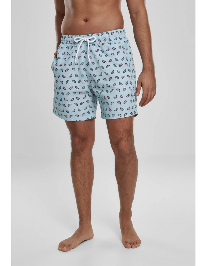 Co by to bylo za léto bez melounů? Místo hledání odpovědi na tuto otázku si prostě oblékněte tyto stylové šortky a noste své osobní melouny na kůži. Šťavnaté plátky jsou podloženy svěží oceánskou modří a také tmavou nášivkou loga Urban Classics na levé straně. Módní kousek plavek je doplněn elastickým pasem se stahovací šňůrkou a dlouhými šňůrkami.