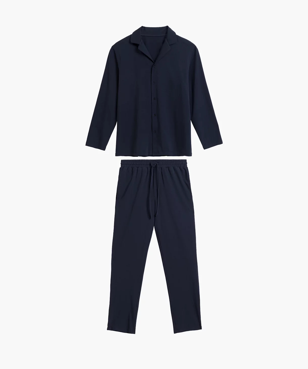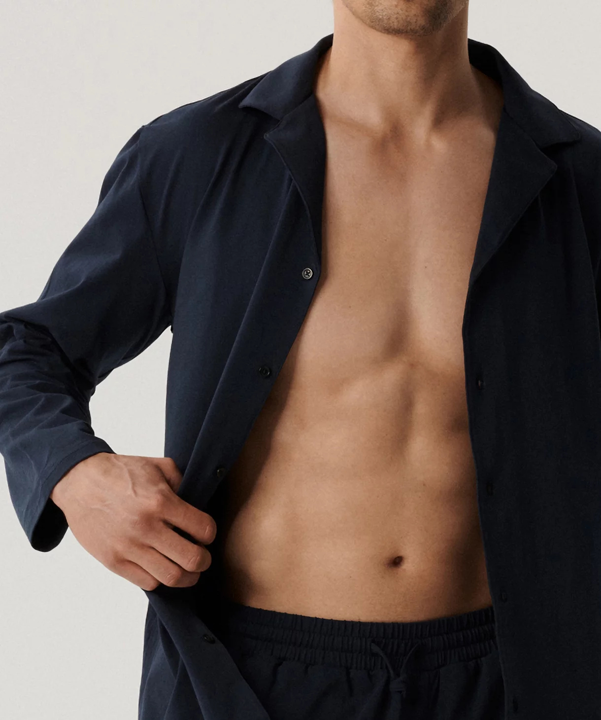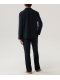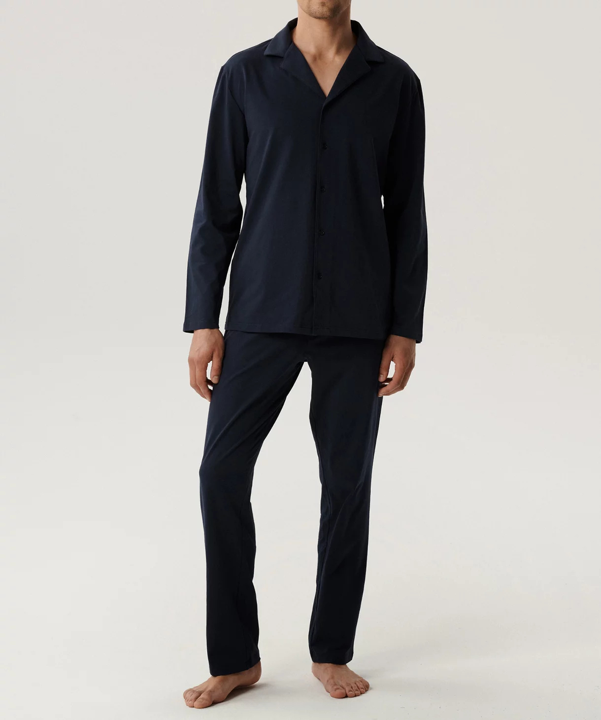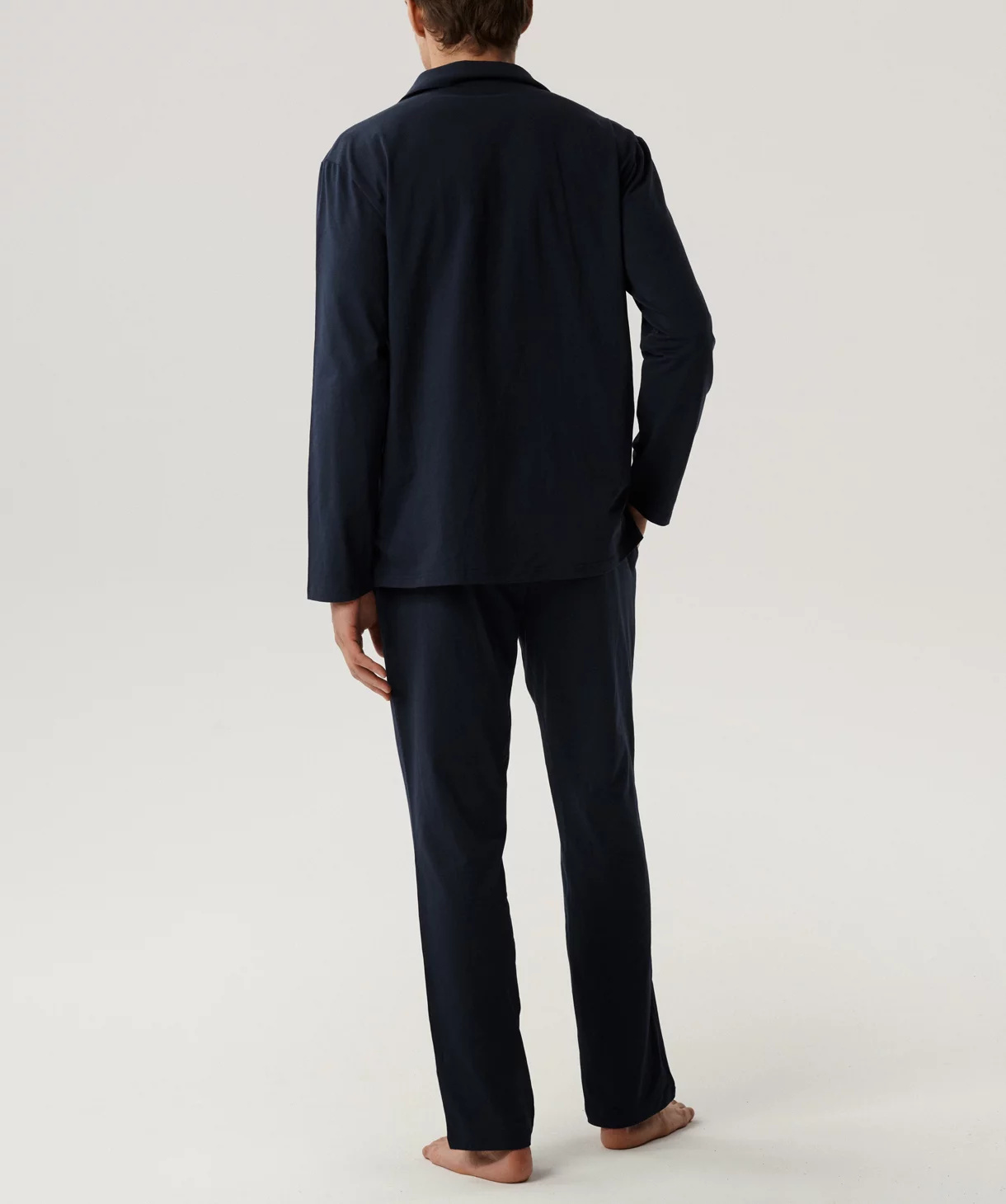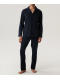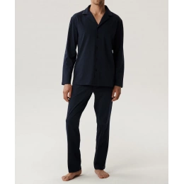 Przedstawiamy naszą piżamową propozycję męską na wiosenno-letnie noce. W skład piżamy w głębokim odcieniu granatowego wchodzi zapinana na guziki góra o koszulowym charakterze, z długimi rękawami i dekoltem w kształcie litery V oraz długie spodnie z prostymi nogawkami.