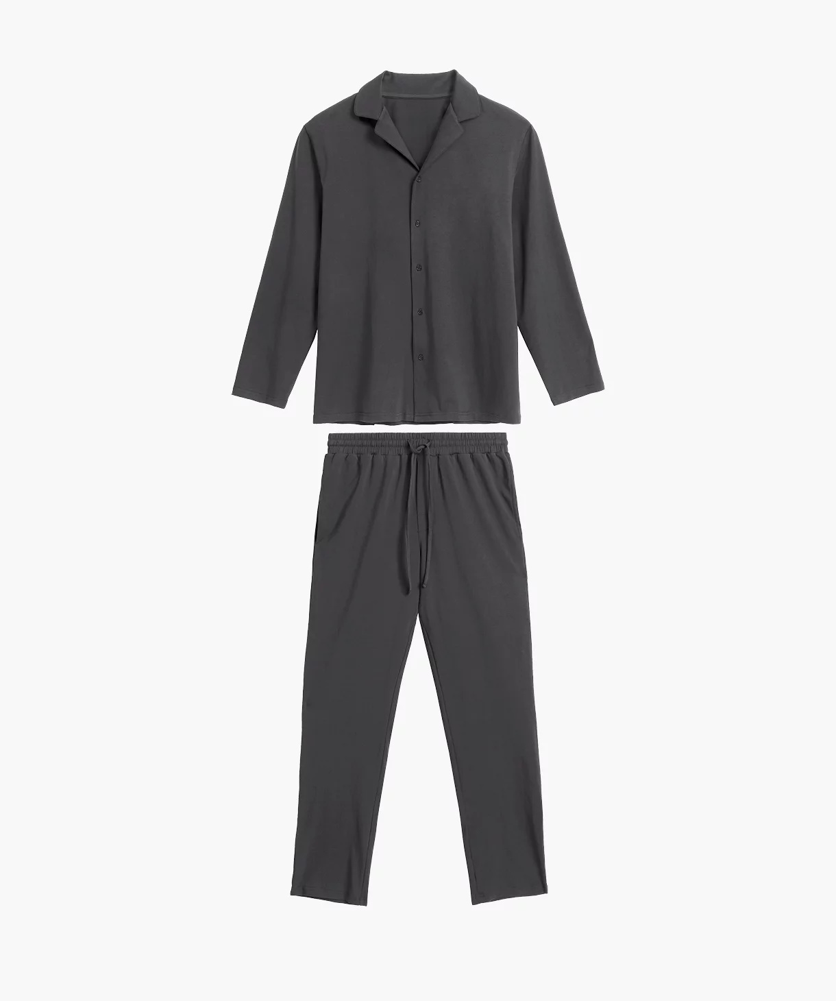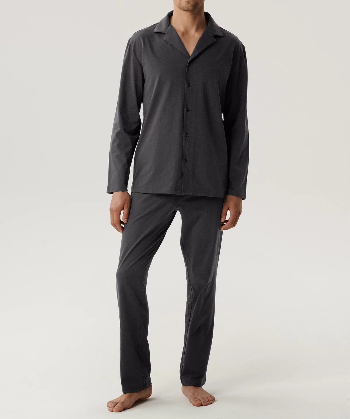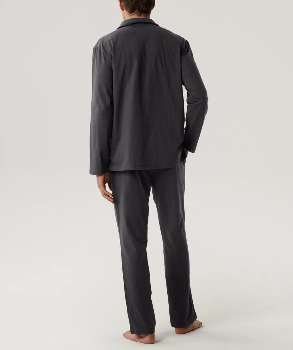 Poznaj idealną piżamę dla fanów klasycznych krojów. W skład męskiej piżamy w kolorze ciemno-szarym wchodzi zapinana na guziki góra o koszulowym charakterze, z długimi rękawami i dekoltem w kształcie litery V oraz długie spodnie z prostymi nogawkami.