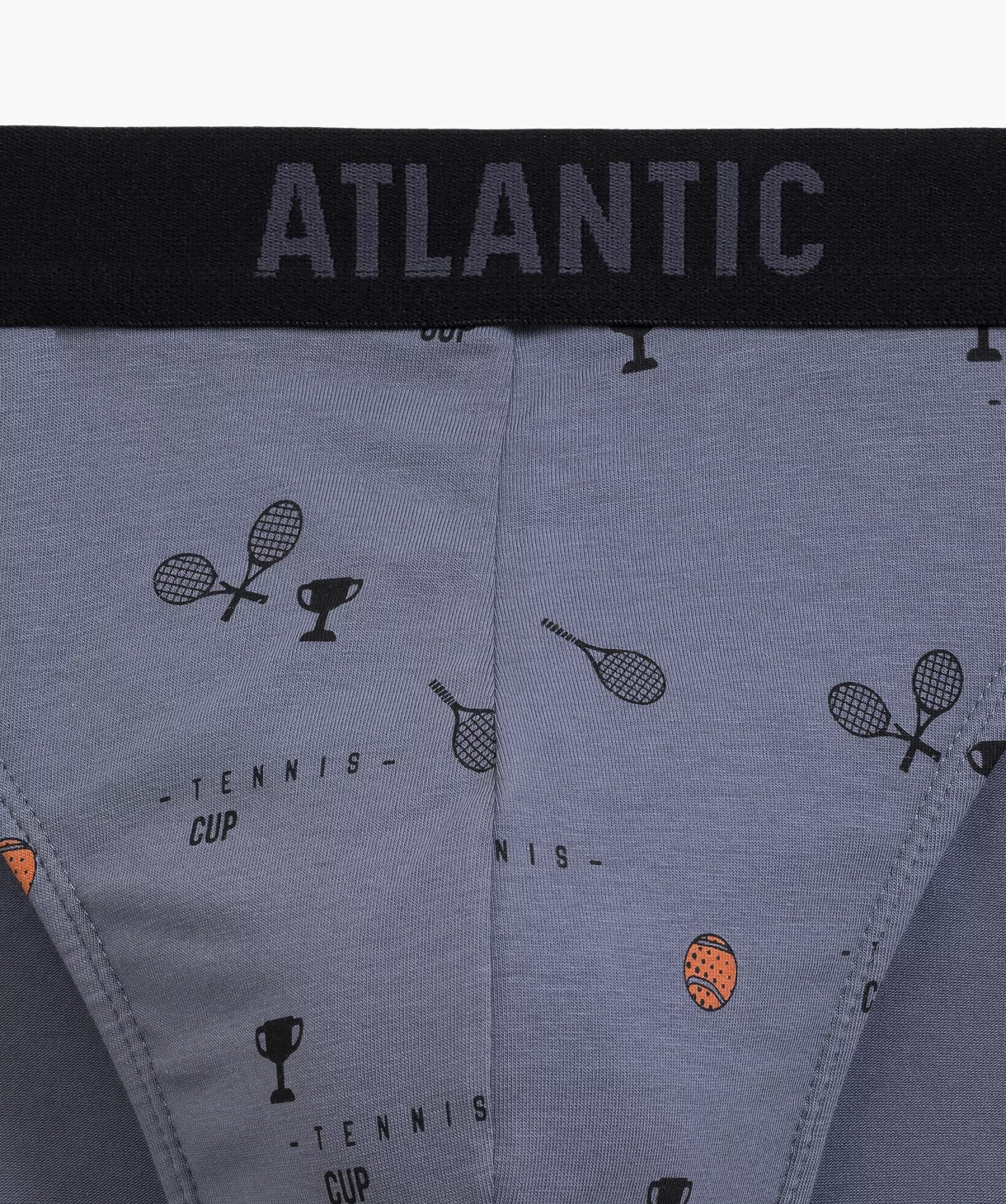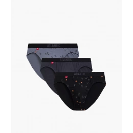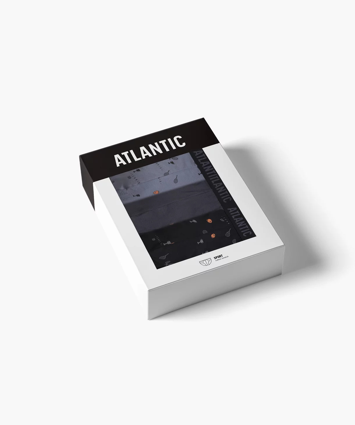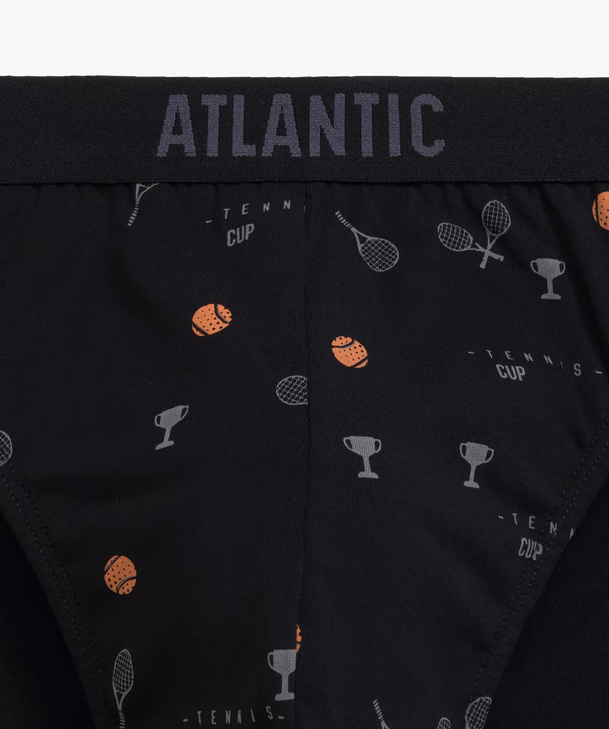 W 3-packu znajdują się slipy męskie w kolorach: czarnym i niebieskim (pokryte nadrukiem w piłeczki i rakiety do tenisa) oraz grafitowym (gładkie). Slipy o sportowym kroju mają niski stan wykończony miękką i nieuciskającą, dość szeroką gumą zewnętrzną z napisem Atlantic oraz głęboko wycięte boki.