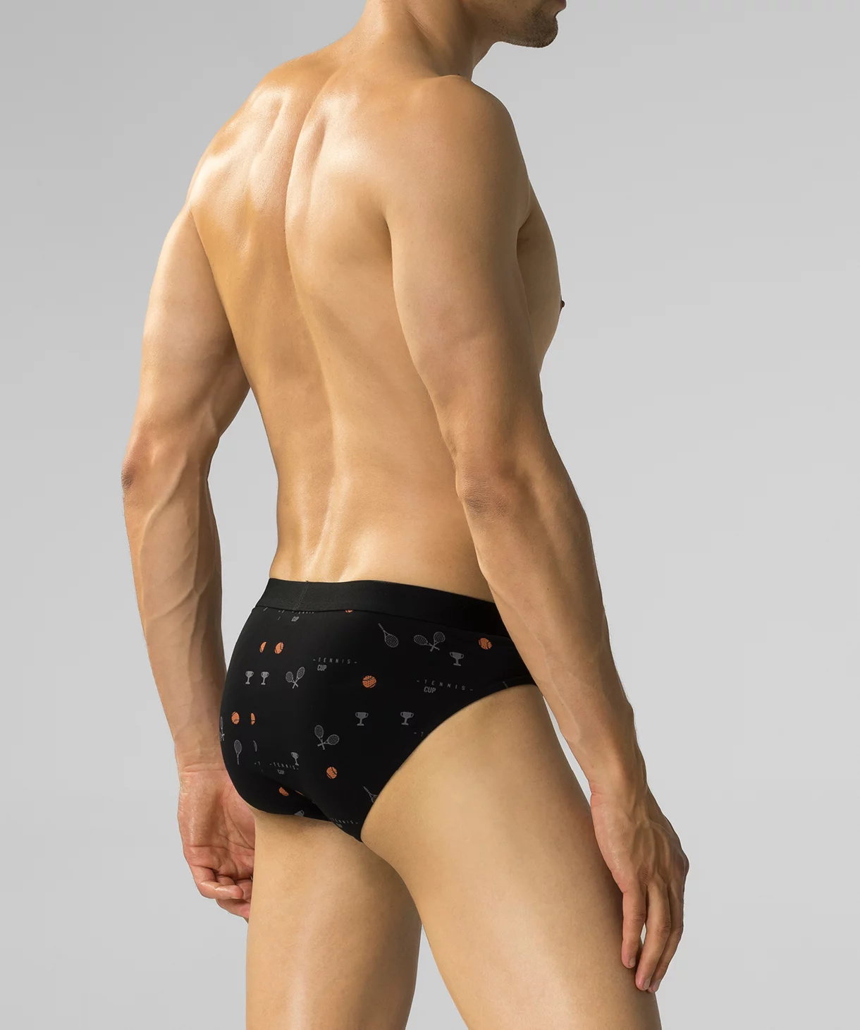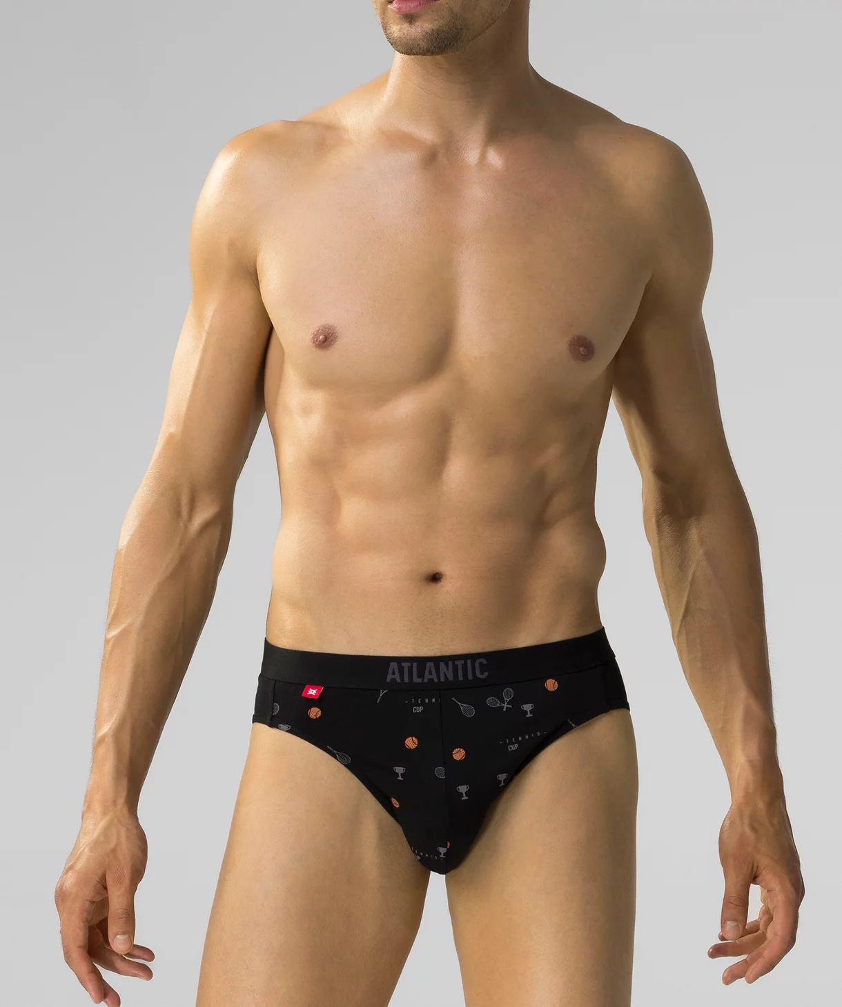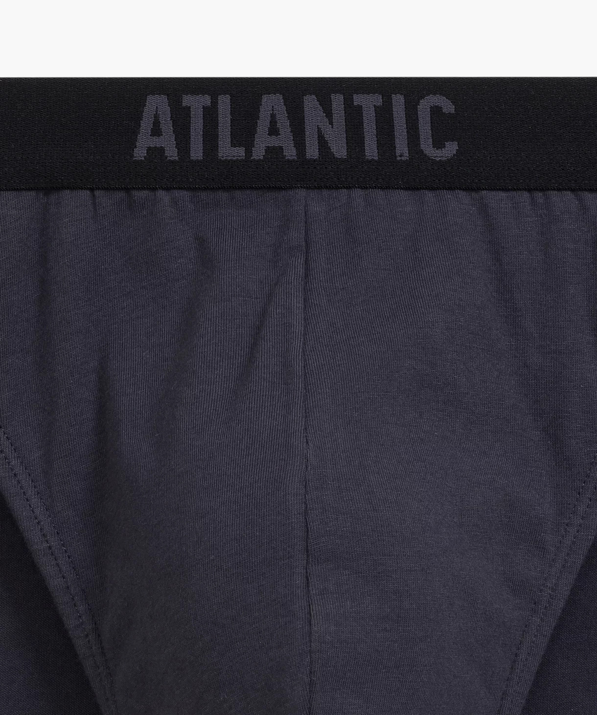 W 3-packu znajdują się slipy męskie w kolorach: czarnym i niebieskim (pokryte nadrukiem w piłeczki i rakiety do tenisa) oraz grafitowym (gładkie). Slipy o sportowym kroju mają niski stan wykończony miękką i nieuciskającą, dość szeroką gumą zewnętrzną z napisem Atlantic oraz głęboko wycięte boki.