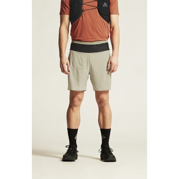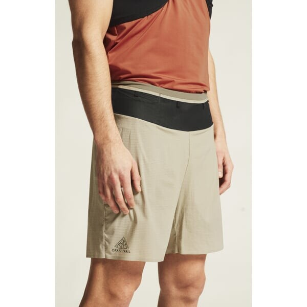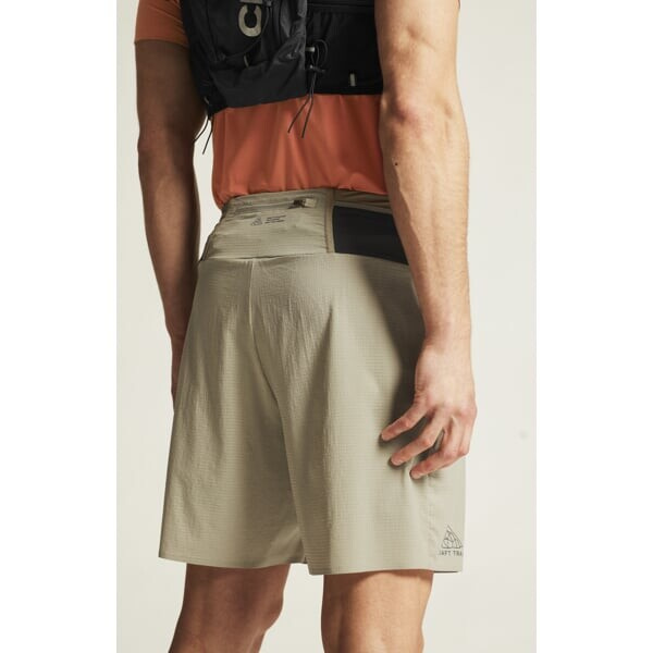 Pánské běžecké šortky 2 v 1 CRAFT PRO Trail jsou velmi lehké, prodyšné a poskytují spoustu kapes pro uložení výživy nebo jiných drobností.