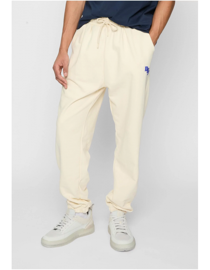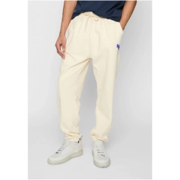 Tepláky s elastickým pasem a šňůrkou na utažení pro maximální pohodlí. Tepláky mají volný střih a zúžené nohavice zakončené manžetami, což zajišťuje moderní a sportovní vzhled. Na levé straně je malé modré logo, které dodává jemný detail. Tento kousek je ideální pro neformální příležitosti nebo domácí nošení, přičemž nabízí pohodlí i styl.