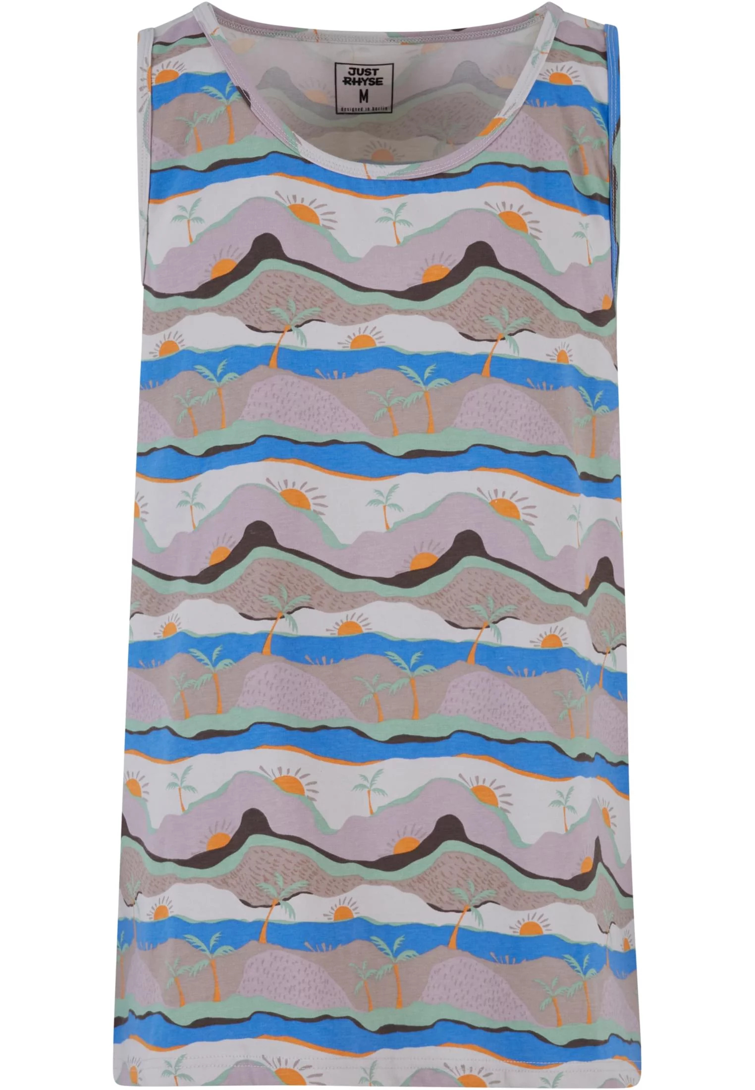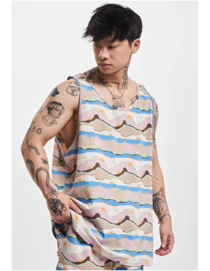 Tílko má vzor inspirovaný krajinou s motivy hor, slunce, palem a mořských vln v pastelových barvách, jako jsou béžová, modrá, zelená a oranžová. Tílko má hlubší průramky, což zajišťuje pohodlí a volnost pohybu, ideální pro teplé letní dny. Celkový vzhled je ležérní a stylový, vhodný pro neformální nošení. Tento kousek lze kombinovat s odpovídajícími kraťasy nebo jinými letními kousky pro pohodový a svěží outfit.