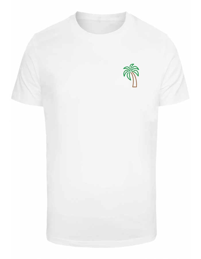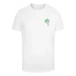Tričko na obrázku je bílé barvy a má jednoduchý design. Na levé straně hrudníku je malý potisk, který zobrazuje stylizovanou palmu s hnědým kmenem a zelenými listy. Tento minimalistický motiv dodává tričku letní a uvolněnou atmosféru. Díky svému čistému a nenápadnému vzhledu je tričko univerzálním kouskem, který se snadno kombinuje s jinými styly oblečení a je vhodné pro každodenní nošení.