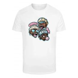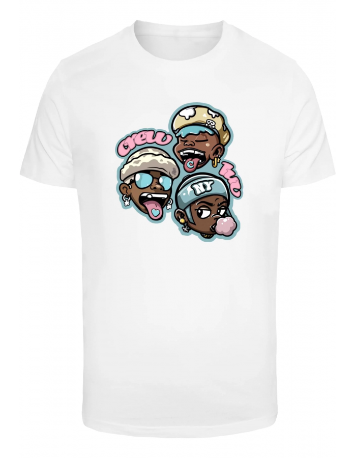 Stylové bílé tričko s výrazným grafickým potiskem na hrudi. Na tričku jsou zobrazeny tři kreslené postavy s různými výrazy tváře, doplněné nápisy "CREW" a "LUV" v růžové a modré barvě. Postavy mají módní doplňky, jako čepice, brýle a náušnice, což tričku dodává moderní a urbanistický vzhled. Tento hravý a kreativní design je ideální pro ty, kteří hledají jedinečný a trendy kousek do svého šatníku. Tričko je vyrobeno z příjemného materiálu a nabízí pohodlí pro každodenní nošení.