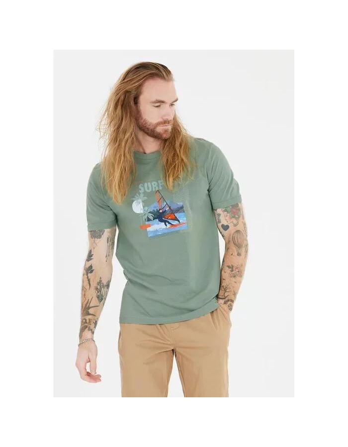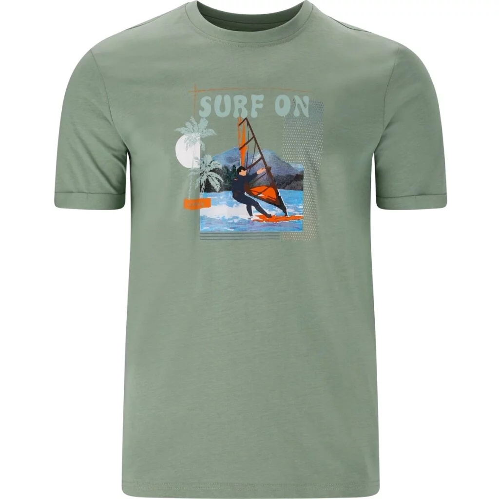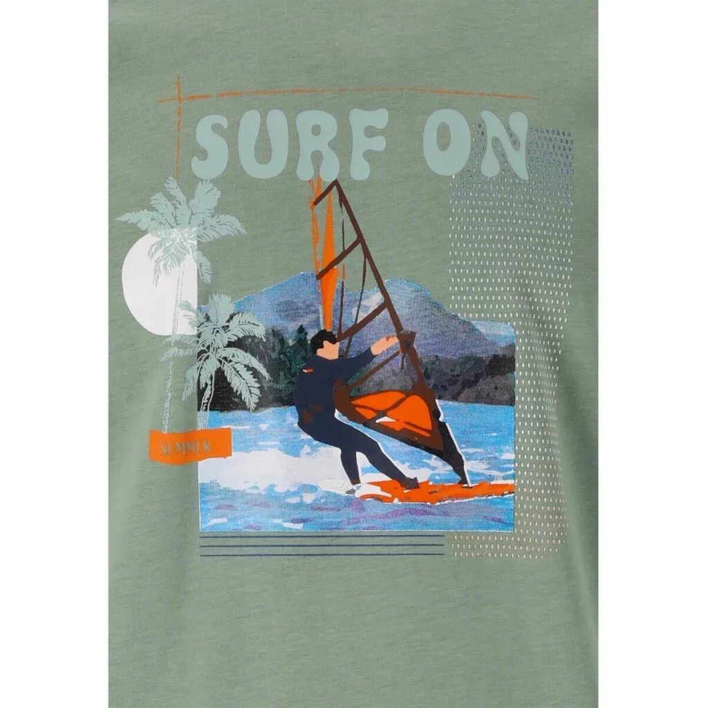 Na přední straně dominuje výrazný potisk s motivem windsurfingu, palmami a nápisem „SURF“, což podtrhuje jeho ležérní, letní charakter.