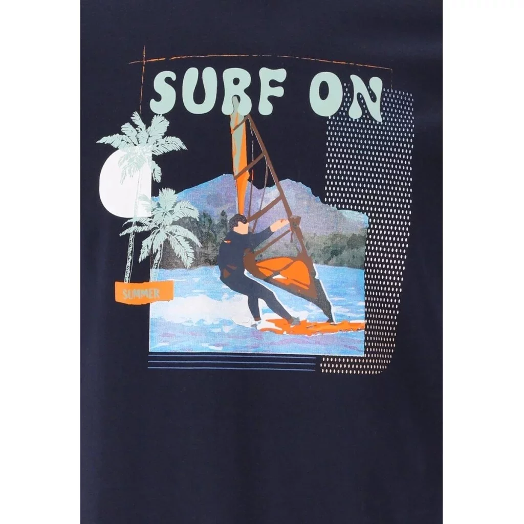 Na přední straně dominuje výrazný potisk s motivem windsurfingu, palmami a nápisem „SURF“, což podtrhuje jeho ležérní, letní charakter.