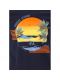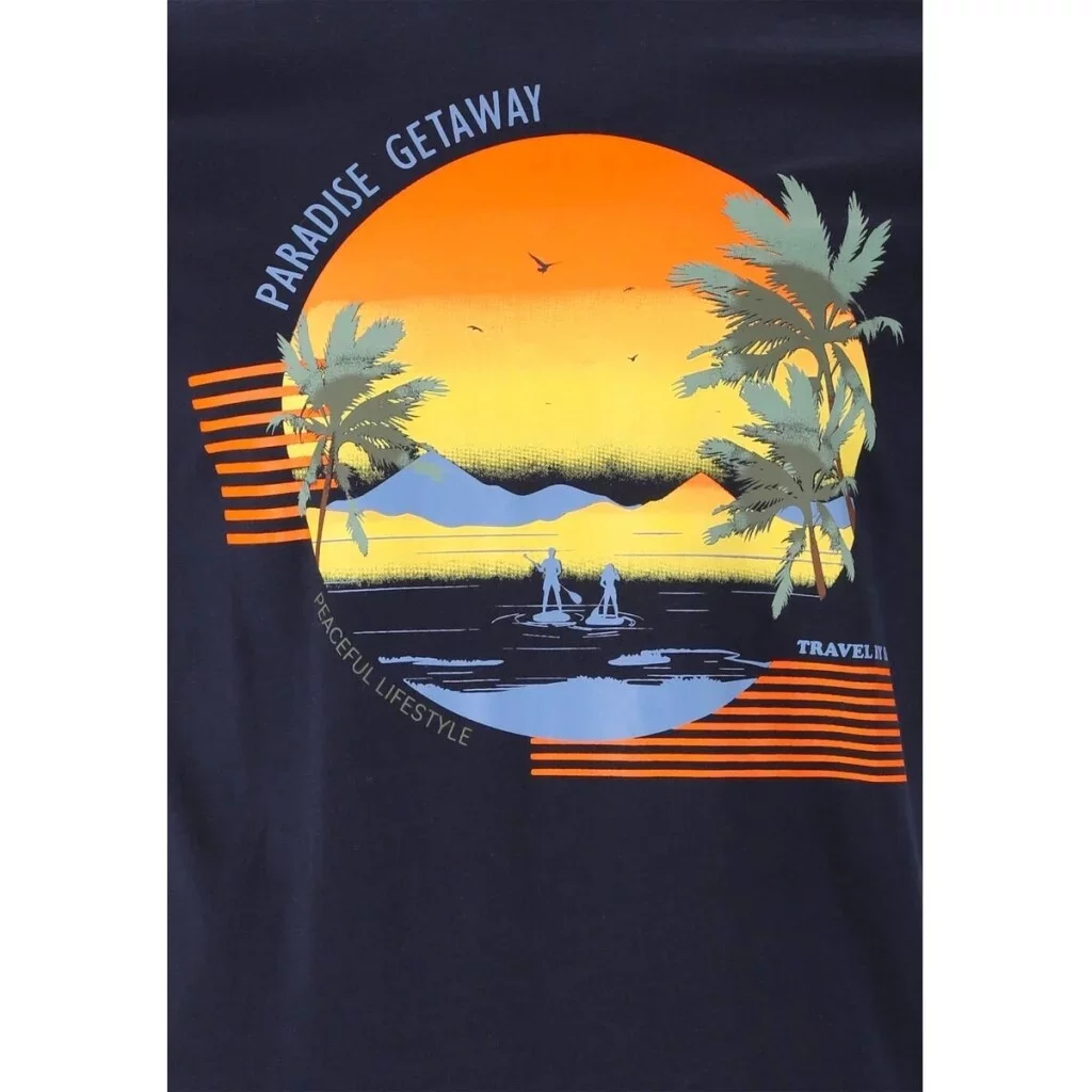 Dominantním prvkem je barevný potisk na hrudi s motivem západu slunce, palem a paddleboardistů, doplněný texty „PARADISE GETAWAY“, „PEACEFUL LIFESTYLEa „TRAVEL BY SEA“. Tento design navozuje atmosféru klidu, dobrodružství a letního volného času.
