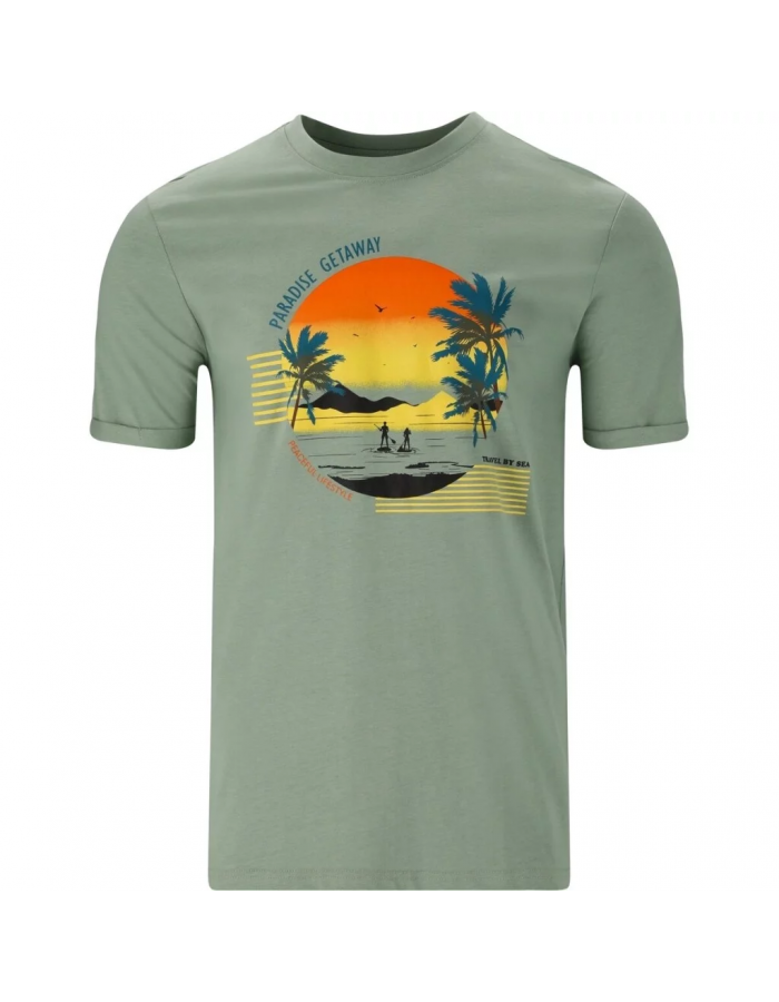 Dominantním prvkem je barevný potisk na hrudi s motivem západu slunce, palem a paddleboardistů, doplněný texty „PARADISE GETAWAY“, „PEACEFUL LIFESTYLEa „TRAVEL BY SEA“. Tento design navozuje atmosféru klidu, dobrodružství a letního volného času.