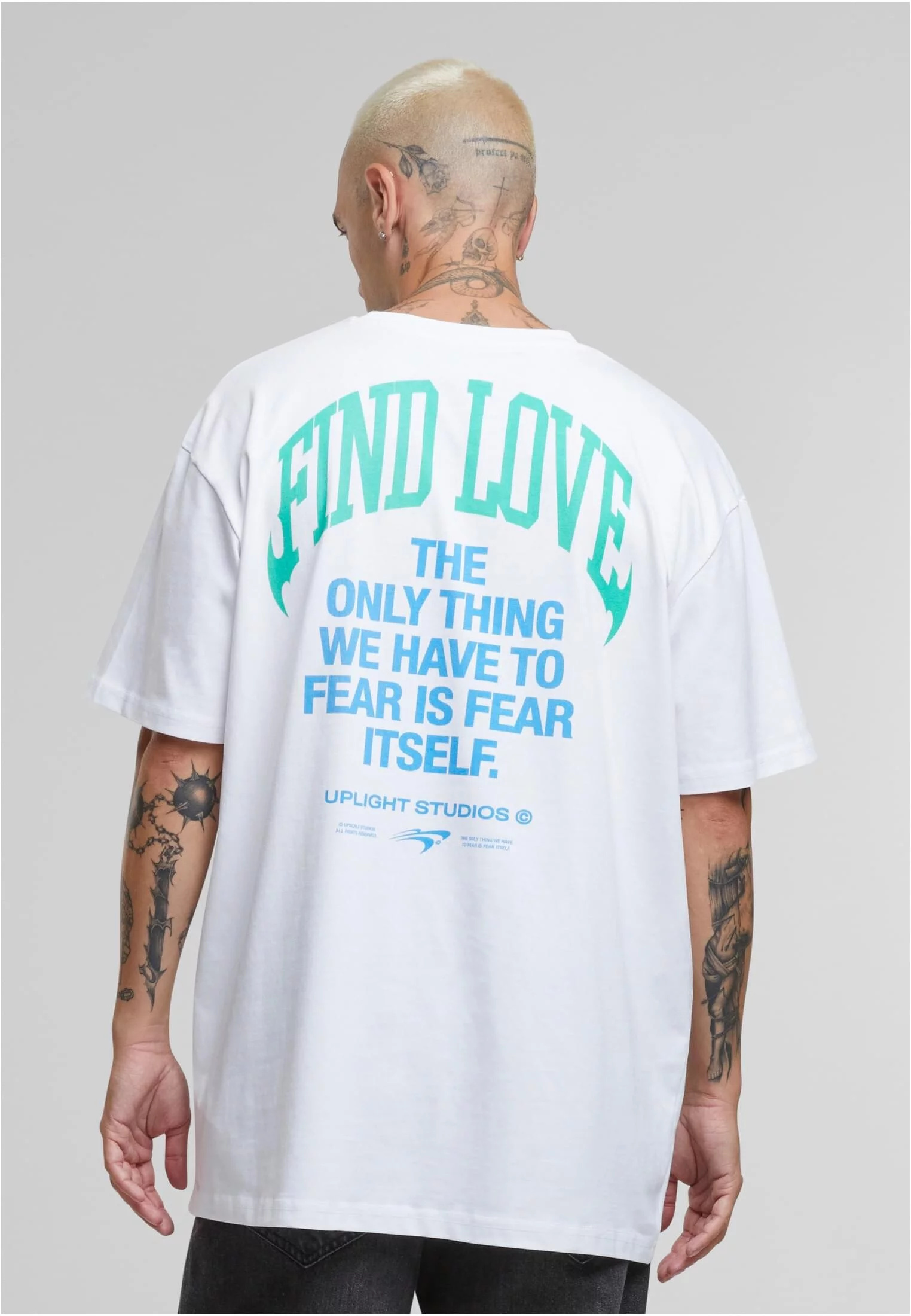Zadní strana trička obsahuje velký nápis „FIND LOVE“ s motivačním textem pod ním: „The only thing we have to fear is fear itself“. Dole je uvedeno „UPLIGHT STUDIOS“, což naznačuje inspiraci značkou, která klade důraz na pozitivní poselství a moderní streetwearovou estetiku.