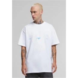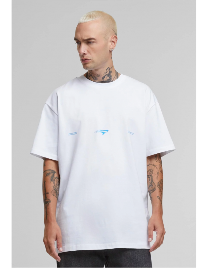 Tričko s krátkým rukávem a oversize střihem. Na přední straně je jednoduché logo s malým motivem rychlosti uprostřed hrudi a dvěma drobnými texty po stranách, které vytvářejí minimalistický design.