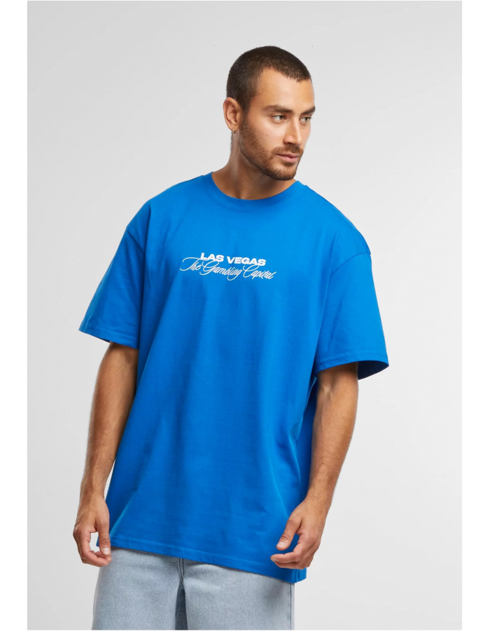 Na přední straně trička je bílý nápis "LAS VEGAS" s podtitulem "The Gambling Capital," napsaný elegantním písmem, což dodává tričku jednoduchý, ale stylový vzhled.