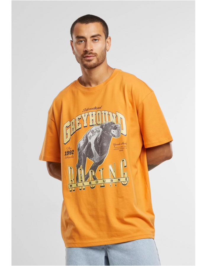 Na přední straně trička je výrazný vintage potisk inspirovaný závody chrtů. Potisk obsahuje nápisy "International Greyhound Racing Melbourne," "The 1992 Finals," a také datum "7th June 1992," které odkazuje na konkrétní závodní událost. Uprostřed potisku je velká černobílá ilustrace závodního chrta v pohybu, který má na sobě číslo 5. Celkově tričko působí jako retro kousek, který evokuje sportovní a nostalgickou atmosféru.