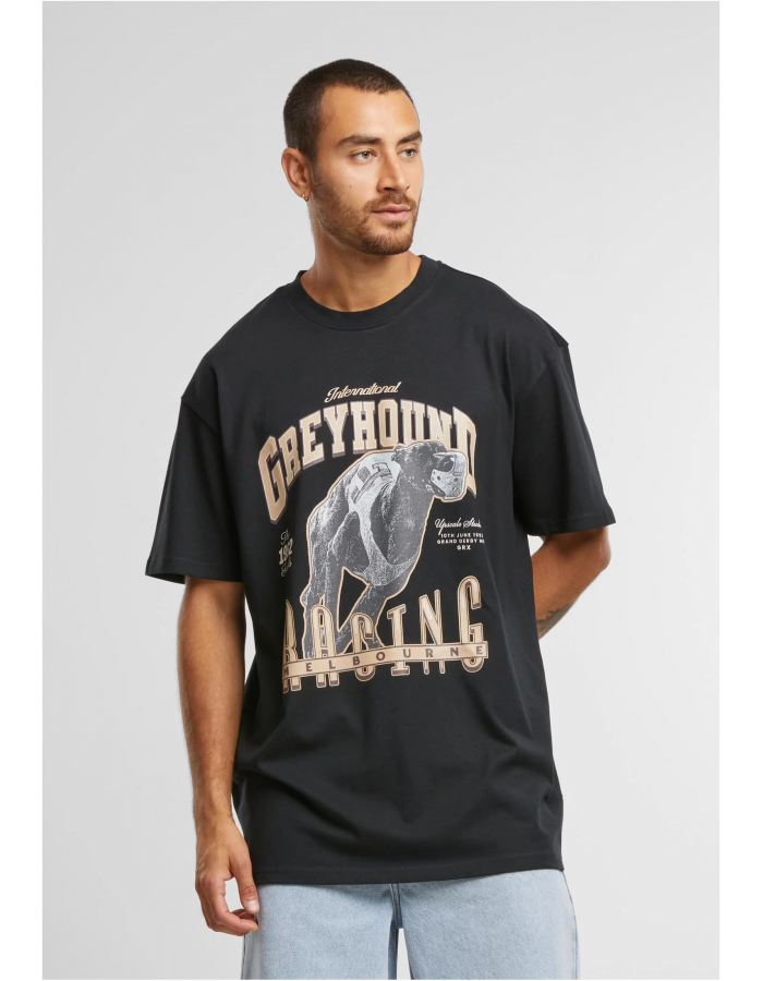 Na přední straně trička je výrazný vintage potisk inspirovaný závody chrtů. Potisk obsahuje nápisy "International Greyhound Racing Melbourne," "The 1992 Finals," a také datum "7th June 1992," které odkazuje na konkrétní závodní událost. Uprostřed potisku je velká černobílá ilustrace závodního chrta v pohybu, který má na sobě číslo 5. Celkově tričko působí jako retro kousek, který evokuje sportovní a nostalgickou atmosféru.