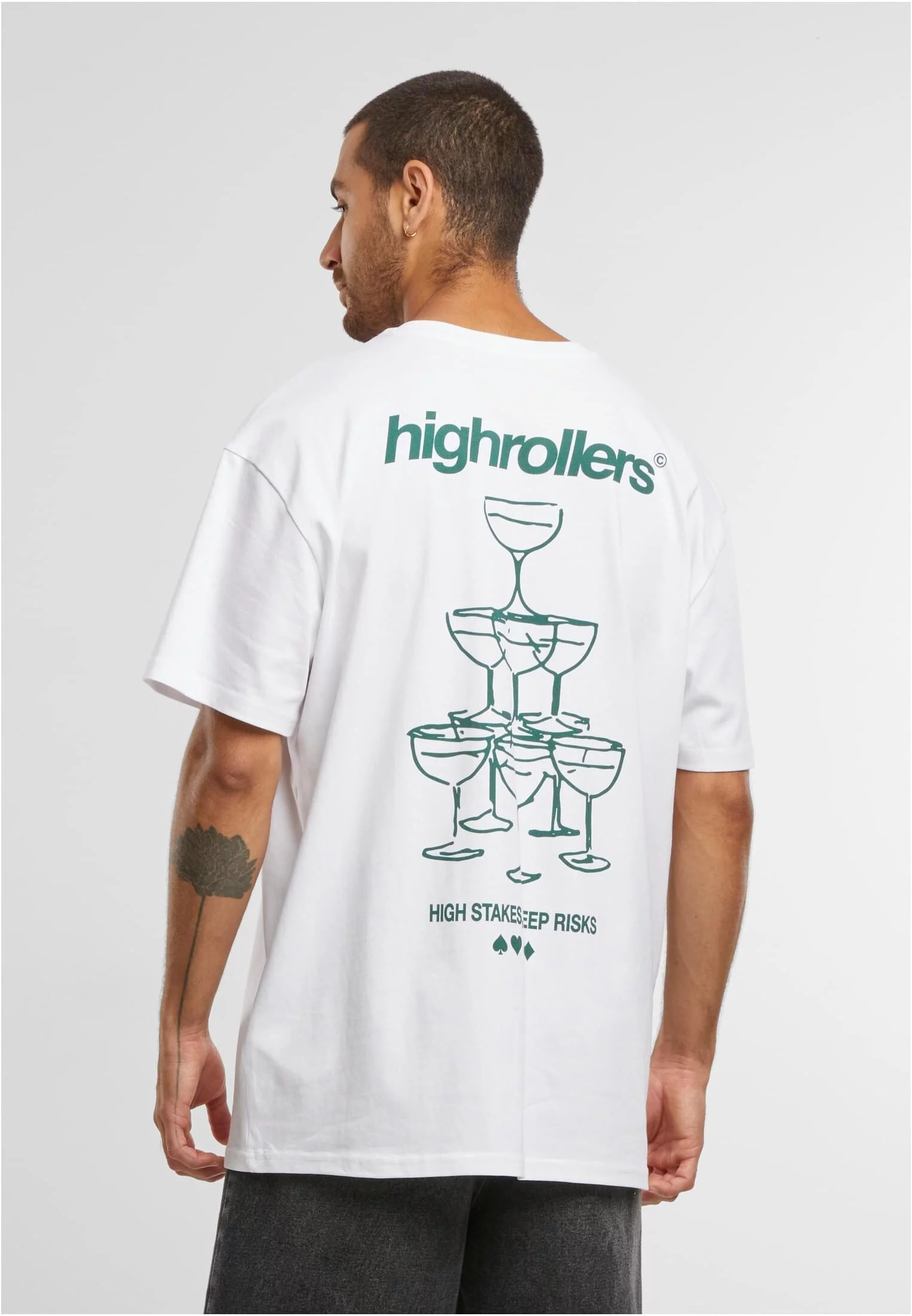 Zadní strana trička má větší potisk s nápisem "highrollers" v horní části, pod kterým je vyobrazen grafický motiv pyramidy tvořené šampaňskými skleničkami. Pod touto grafikou je text "High Stakes, Deep Risks" a opět symboly karetních barev. Design trička evokuje atmosféru hazardu a vysokých sázek, což může oslovit ty, kteří mají rádi tematické a odvážné oblečení. Tričko je moderní a stylové, ideální pro uvolněný, ale zároveň výrazný vzhled.