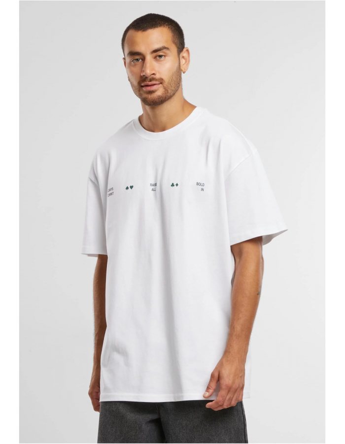 Na přední straně trička jsou tři bílé symboly karetních barev (srdce, kára, piky) se třemi nápisy: "Always Commit," "Raise All," a "Bold In," které jsou rozmístěny vodorovně napříč hrudníkem.