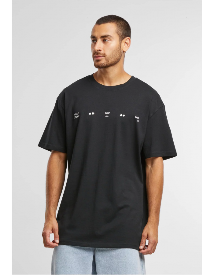 Na přední straně trička jsou tři bílé symboly karetních barev (srdce, kára, piky) se třemi nápisy: "Always Commit," "Raise All," a "Bold In," které jsou rozmístěny vodorovně napříč hrudníkem.