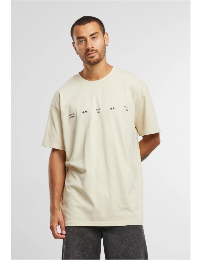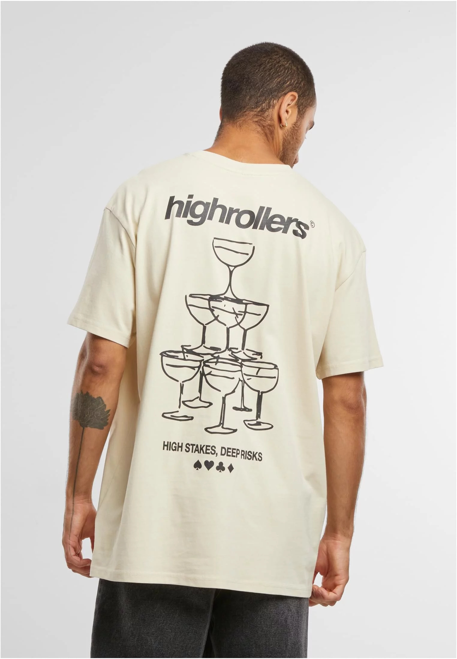 Zadní strana trička má větší potisk s nápisem "highrollers" v horní části, pod kterým je vyobrazen grafický motiv pyramidy tvořené šampaňskými skleničkami. Pod touto grafikou je text "High Stakes, Deep Risks" a opět symboly karetních barev. Design trička evokuje atmosféru hazardu a vysokých sázek, což může oslovit ty, kteří mají rádi tematické a odvážné oblečení. Tričko je moderní a stylové, ideální pro uvolněný, ale zároveň výrazný vzhled.