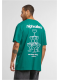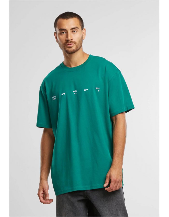 Zadní strana trička má větší potisk s nápisem "highrollers" v horní části, pod kterým je vyobrazen grafický motiv pyramidy tvořené šampaňskými skleničkami. Pod touto grafikou je text "High Stakes, Deep Risks" a opět symboly karetních barev. Design trička evokuje atmosféru hazardu a vysokých sázek, což může oslovit ty, kteří mají rádi tematické a odvážné oblečení. Tričko je moderní a stylové, ideální pro uvolněný, ale zároveň výrazný vzhled.