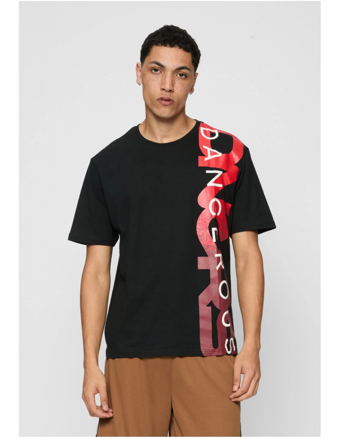 Černé tričko s krátkým rukávem značky Dangerous DNGRS. Tričko je ozvláštněno výrazným červeným potiskem se slovy 'DANGEROUS', které jsou umístěny svisle na levé straně a přecházejí z přední části na rameno. Tento moderní a odvážný design se hodí do městského stylu a je ideální pro ty, kteří chtějí vyjádřit svou jedinečnost a sebevědomí.