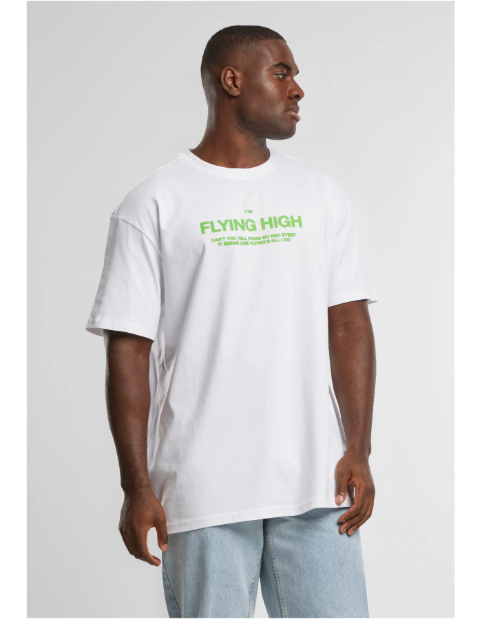 Tričko s krátkým rukávem a zeleným potiskem na přední straně. Nápis „I BE FLYING HIGH“ je výrazně umístěn uprostřed, pod ním je menší text: „Can't you tell from my red eyes? It seems like flying’s all I do.“ Tričko má volný střih a moderní design, který se hodí pro neformální příležitosti. Ideální pro ty, kteří preferují stylový a výrazný vzhled.