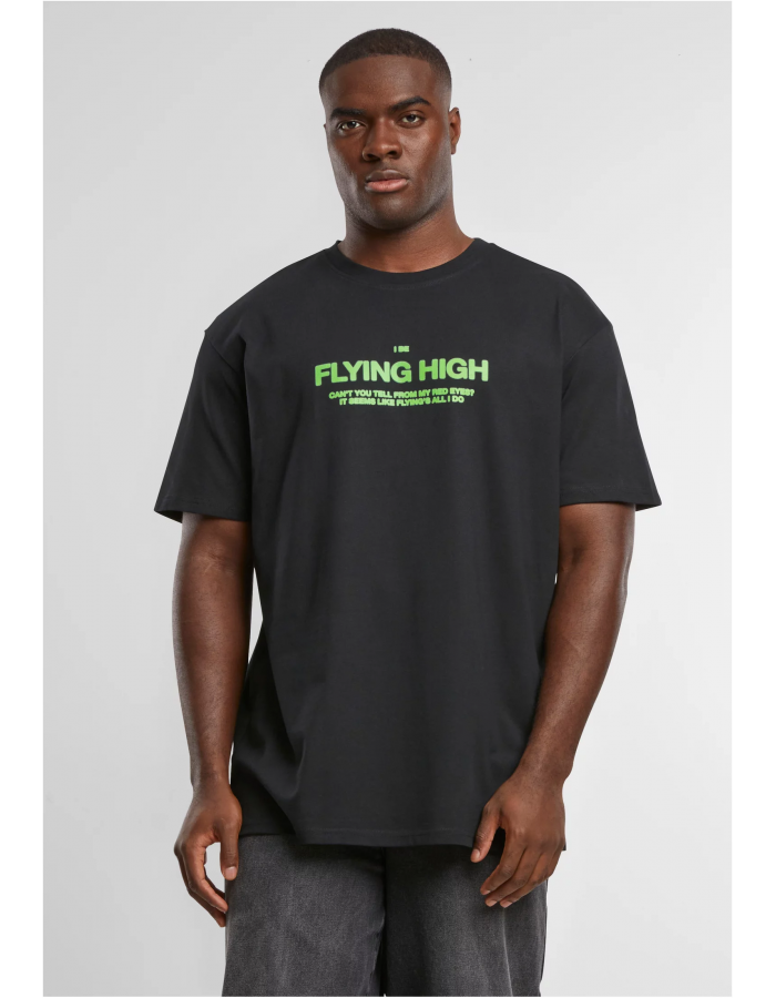Tričko s krátkým rukávem a zeleným potiskem na přední straně. Nápis „I BE FLYING HIGH“ je výrazně umístěn uprostřed, pod ním je menší text: „Can't you tell from my red eyes? It seems like flying’s all I do.“ Tričko má volný střih a moderní design, který se hodí pro neformální příležitosti. Ideální pro ty, kteří preferují stylový a výrazný vzhled.