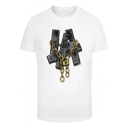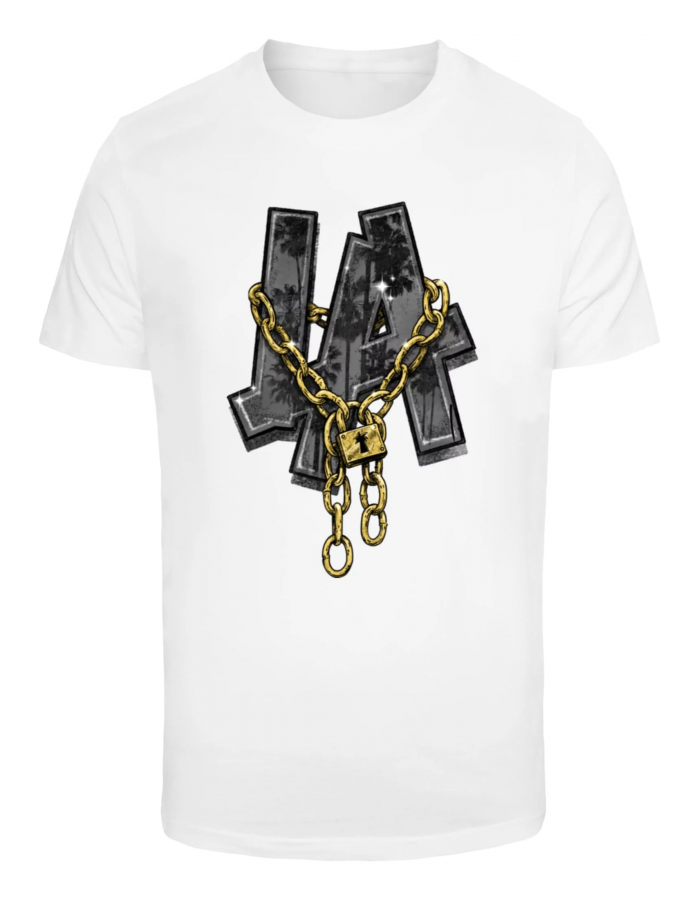 Tričko s výrazným potiskem písmen „LA“ na přední straně. Písmena jsou vyvedena ve stínovaném stylu s náznaky palem, což evokuje atmosféru Los Angeles. Přes písmena je umístěn zlatý řetěz s visacím zámkem, který dodává designu streetwearový a moderní nádech. Tričko má klasický střih s krátkými rukávy, ideální pro neformální styl a milovníky městské módy.