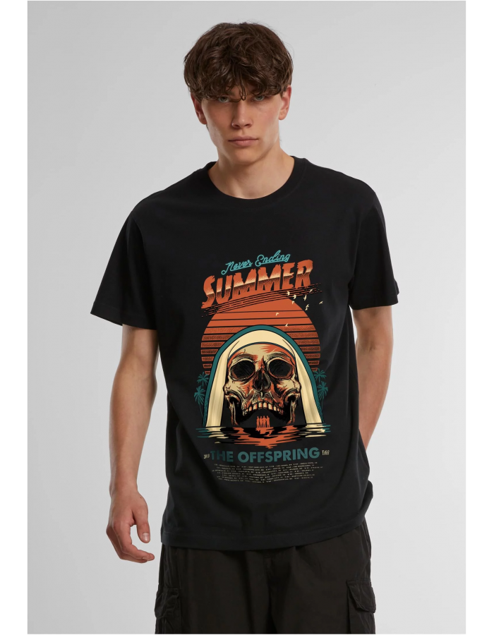 Tričko s krátkým rukávem, které má výrazný grafický potisk na přední straně. Potisk zobrazuje lebku zahalenou do pláště, vycházející z vody s oranžovým západem slunce v pozadí. Nad grafikou je nápis "Never Ending Summer" a pod ní je nápis "The Offspring." Design evokuje temnou, ale zároveň stylovou atmosféru, s nádechem rockové a alternativní estetiky. Toto tričko je ideální pro fanoušky kapely The Offspring nebo pro ty, kteří mají rádi výrazné a originální motivy na oblečení.