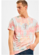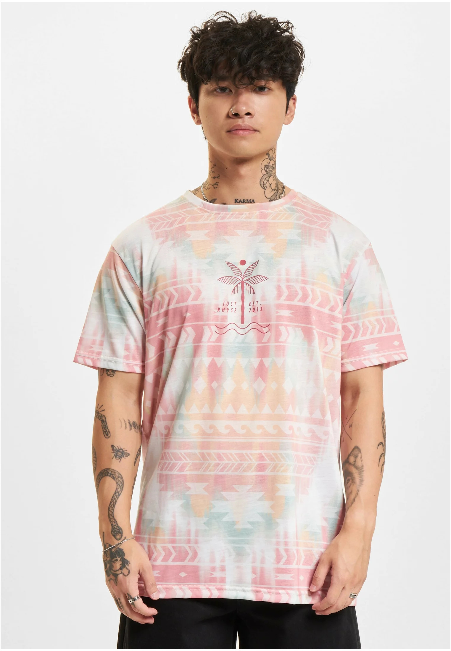 Tričko s krátkým rukávem má barevný vzor s pastelovými odstíny růžové, modré a oranžové, který připomíná jemný akvarelový tisk s etnickými motivy. V oblasti hrudníku je malý minimalistický potisk s palmou a nápisem "Just Rhyse Est. 2012". Tričko je ideální pro ležérní letní outfity a má svěží, uvolněný vzhled, který se hodí k džínům nebo šortkám.