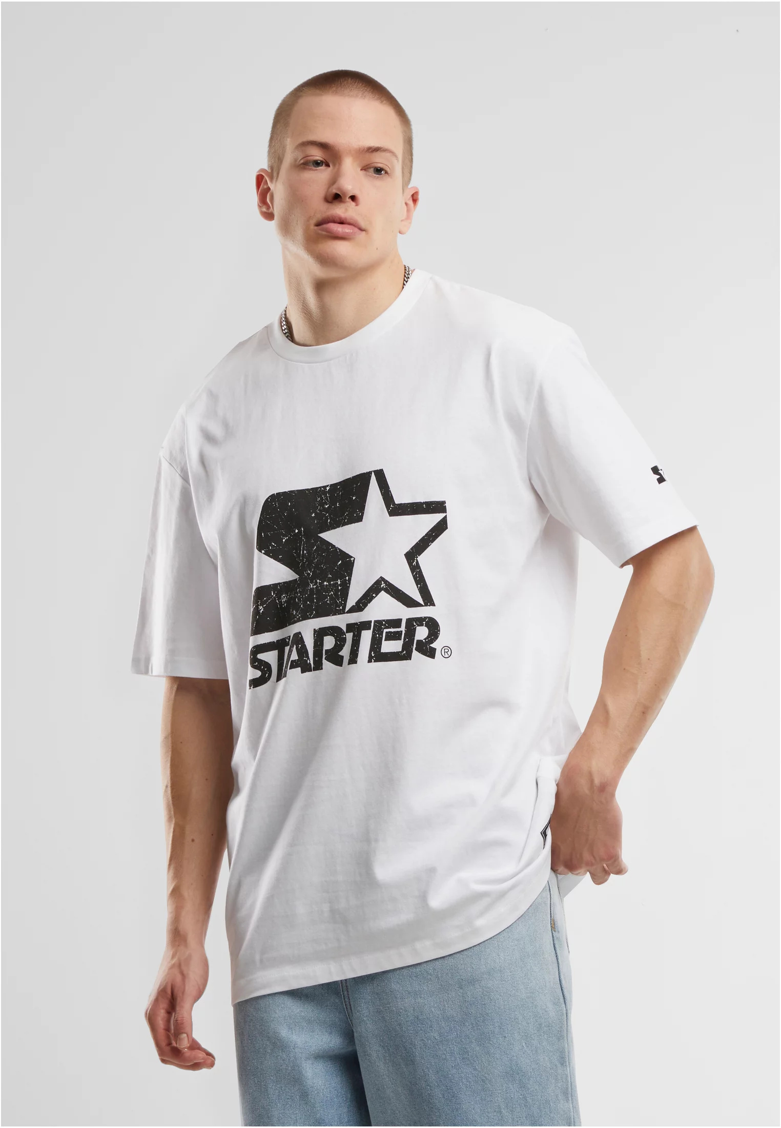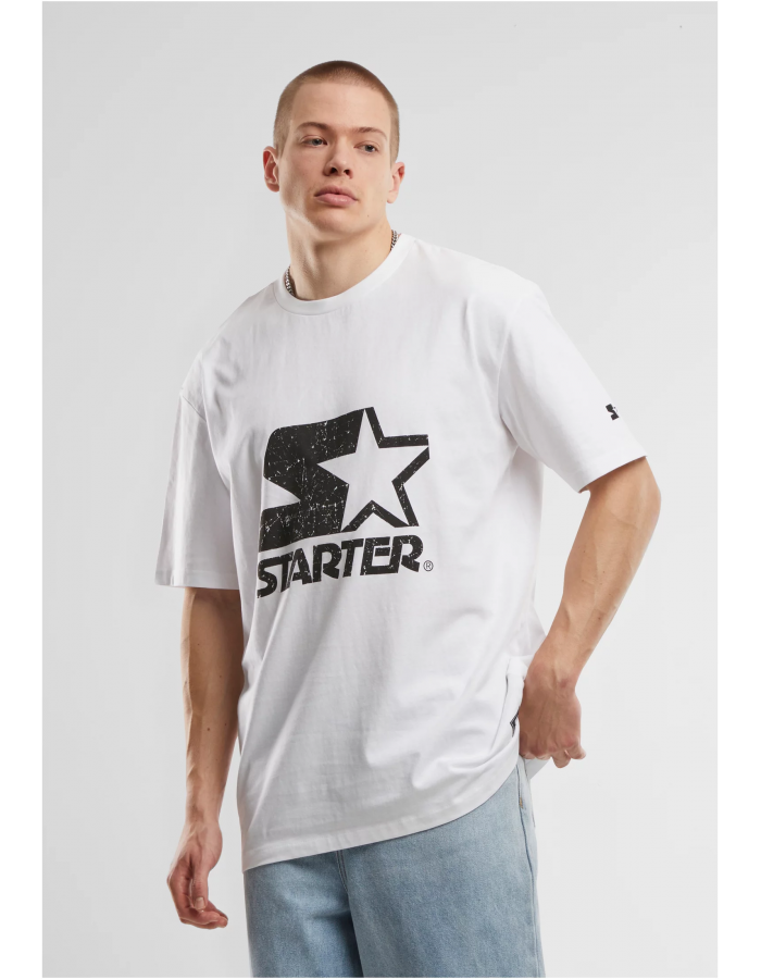 Tričko s krátkým rukávem, zdobené ikonickým logem značky Starter na přední straně. Logo obsahuje velkou hvězdu a nápis „STARTER“, vše s mírně oprýskaným, vintage vzhledem, který dodává tričku retro styl. Střih trička je volný a pohodlný, vhodný pro každodenní nošení, ideální pro sportovní i ležérní outfity.