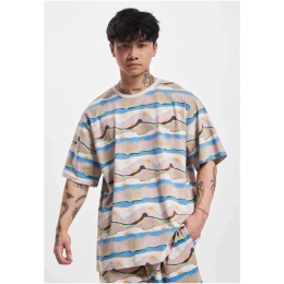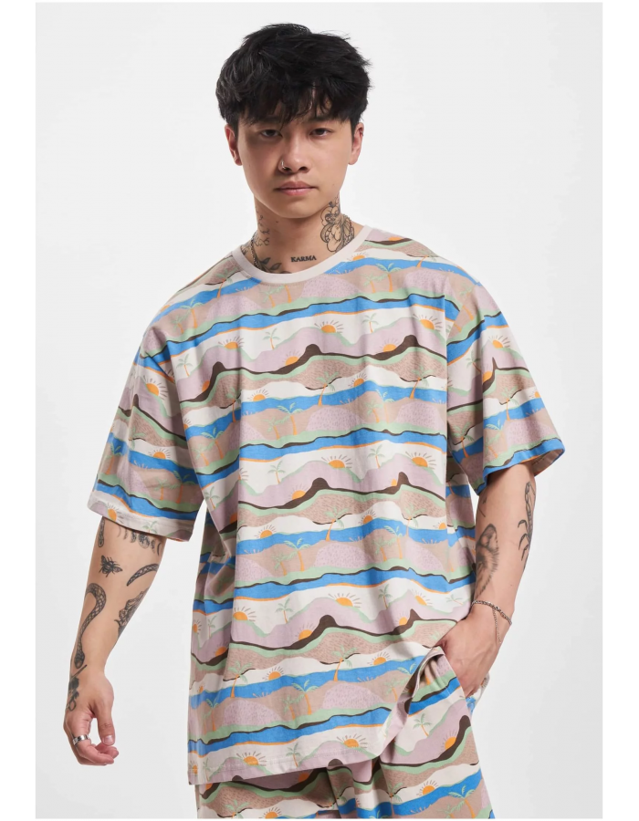 Oversized tričko s krátkými rukávy a barevným vzorem inspirovaným krajinou. Vzor zahrnuje motivy slunce, hor, palem a mořských vln v pastelových barvách, jako jsou béžová, modrá, zelená a oranžová. Tričko má volný střih, který zajišťuje pohodlí a moderní vzhled. Tento design je ideální pro neformální a uvolněné outfity, které vyjadřují ležérní a bezstarostný styl. Tričko lze kombinovat s džínami, šortkami nebo dokonce s odpovídajícími kalhotami pro výrazný letní vzhled.