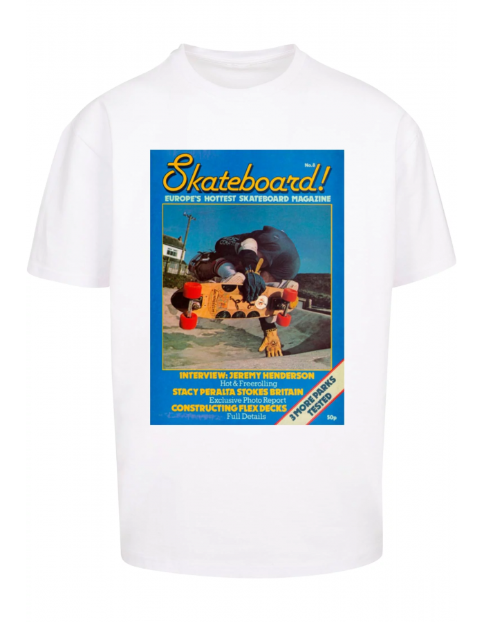 Tričko s krátkým rukávem má na přední straně potisk inspirovaný obálkou skateboardového časopisu. Design je velmi retro, s dominantní fotografií skateboardisty při jízdě, obklopený typickými textovými prvky časopisu, jako jsou nadpisy a popisky článků. Nápisy v modré, žluté a červené barvě dodávají designu energii a evokují atmosféru skateboardingové kultury. Toto tričko je ideální pro milovníky skateboardingu a vintage stylu.