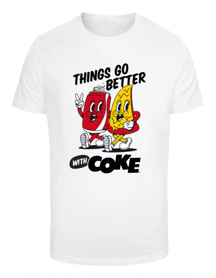 Tričko "Things Go Better with Coke" v bílé barvě je stylovým a nostalgickým kouskem, který vzdává hold klasickému sloganu společnosti Coca-Cola. Bílé tričko s ikonickým červeným nápisem "Things Go Better with Coke" evokuje retro atmosféru a přináší do šatníku svěží a hravý vzhled. Vyrobeno z kvalitního, lehkého materiálu, zajišťuje pohodlí a prodyšnost, ideální pro každodenní nošení. Je perfektní volbou pro milovníky retro stylu, Coca-Coly nebo pro ty, kteří hledají neformální a stylový outfit s výrazným vintage nádechem.