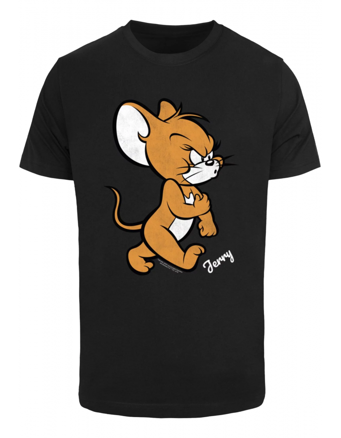 Toto tričko je černé barvy s výrazným potiskem známé kreslené postavičky myši, která vypadá rozčíleně a drží se za ruku. Postavička je doplněna nápisem „Jerry“ ve spodní části. Tričko má klasický kulatý výstřih a krátké rukávy, je vyrobeno z pohodlného materiálu a ideální pro neformální každodenní nošení. Tento design je skvělý pro fanoušky animovaných postaviček a nabízí zábavný, hravý vzhled.