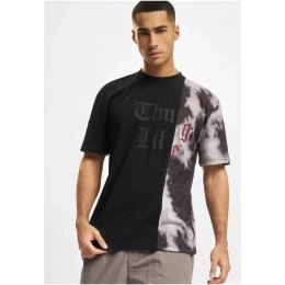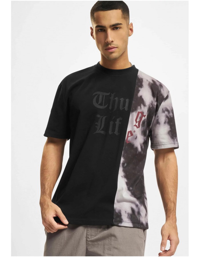 Toto tričko zaujme na první pohled svým unikátním designem, který kombinuje dva výrazně odlišné styly. Přední část je rozdělena na polovinu: levá polovina je jednobarevná černá s tónovaným nápisem "Thug Life" v gotickém stylu, zatímco pravá polovina je potištěna efektem batiky v odstínech šedé a bílé, s nápisem "Life" v kontrastní červené barvě. Tento odvážný design vytváří výrazný kontrast mezi oběma částmi trička, čímž dodává moderní a rebelskou estetiku. Tričko je ideální volbou pro ty, kteří hledají stylový a výrazný kousek do svého šatníku.