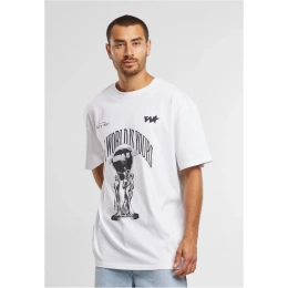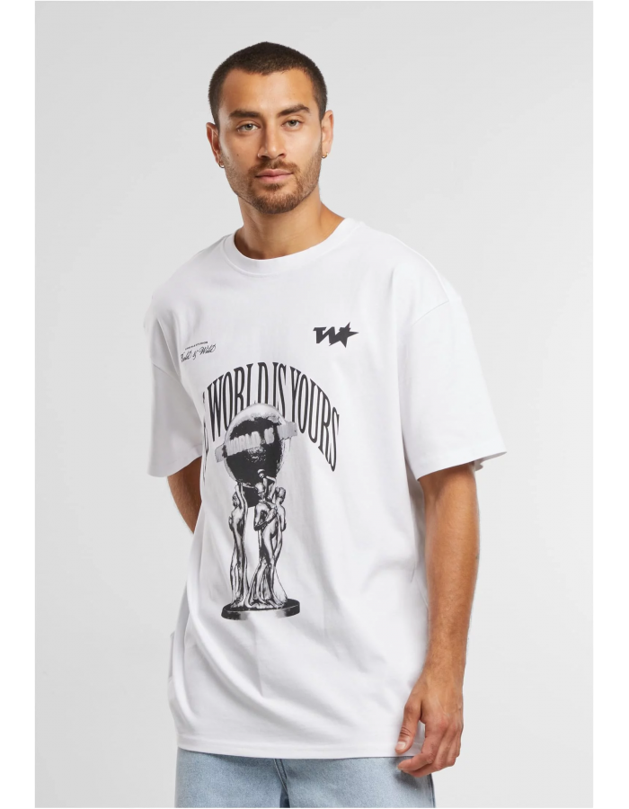 Na přední straně je výrazný černý potisk, který zobrazuje motiv poháru, nad kterým je nápis "The World Is Yours". V horní části vlevo je menší text "Bold & Wild," a na pravé straně hrudníku je malé logo ve tvaru blesku. Na zadní straně trička je menší černé logo "W" s nápisem "Bold & Wild" pod ním, umístěné ve střední části zad. Celkový design trička kombinuje minimalistický styl s odvážným centrálním motivem, který dodává tričku výrazný a moderní vzhled.