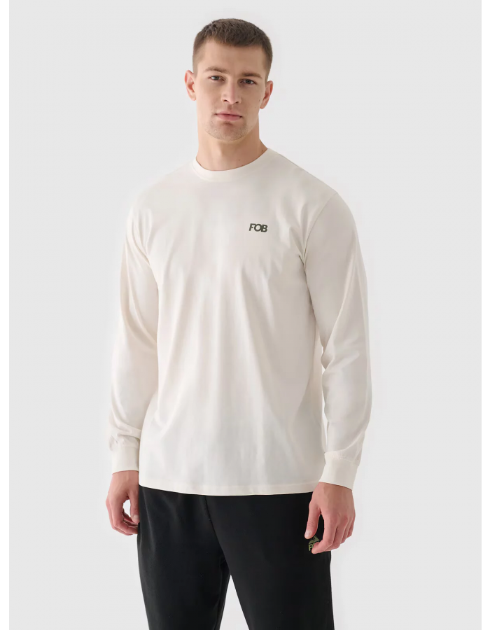 Pánský top s dlouhým rukávem je vyroben ze 100% bavlny, díky čemuž je měkký, odolný a příjemný na dotek. Kulatý výstřih je zakončen mírným žebrováním. Na zadní straně je viditelný potisk s motivem hor. Viditelný nápis "FOB" na přední straně.