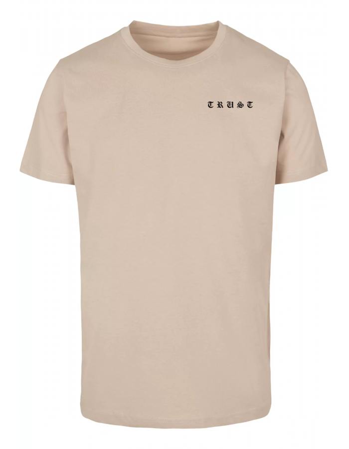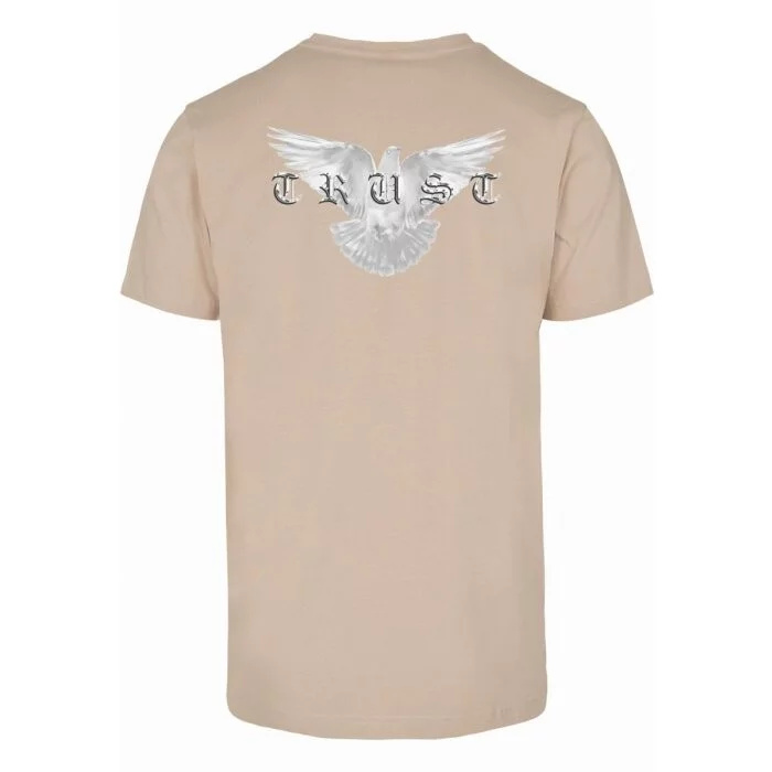 Na zadní straně trika se nachází nápis "Trust", doplněný o motiv holubice, což symbolizuje mír, naději a důvěru. Tento designový prvek dodává triku jedinečný vzhled a umožňuje vám vyjádřit své hodnoty nebo postoje nenápadným, ale působivým způsobem.