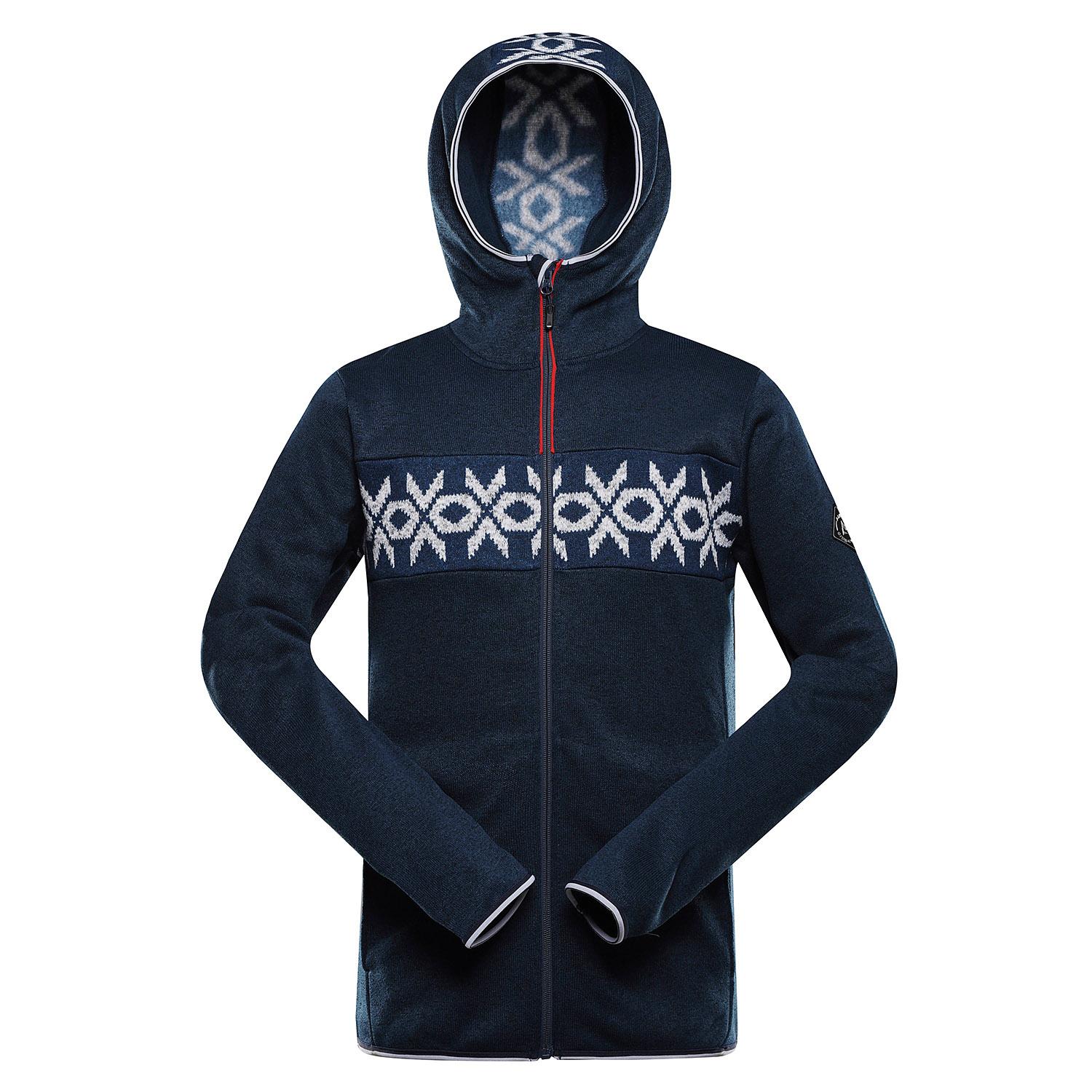 Polopřiléhavý střih zajišťuje pohodlné nošení, zatímco kapuce lemovaná gumou a krytka u brady poskytují ochranu proti větru a chladu. Rukávy a spodní část svetru jsou zakončeny gumovým lemem pro lepší přizpůsobení a komfort. Svetr má dvě praktické kapsy a nášivku na rukávu, delší taháčky u zipů usnadňují manipulaci.