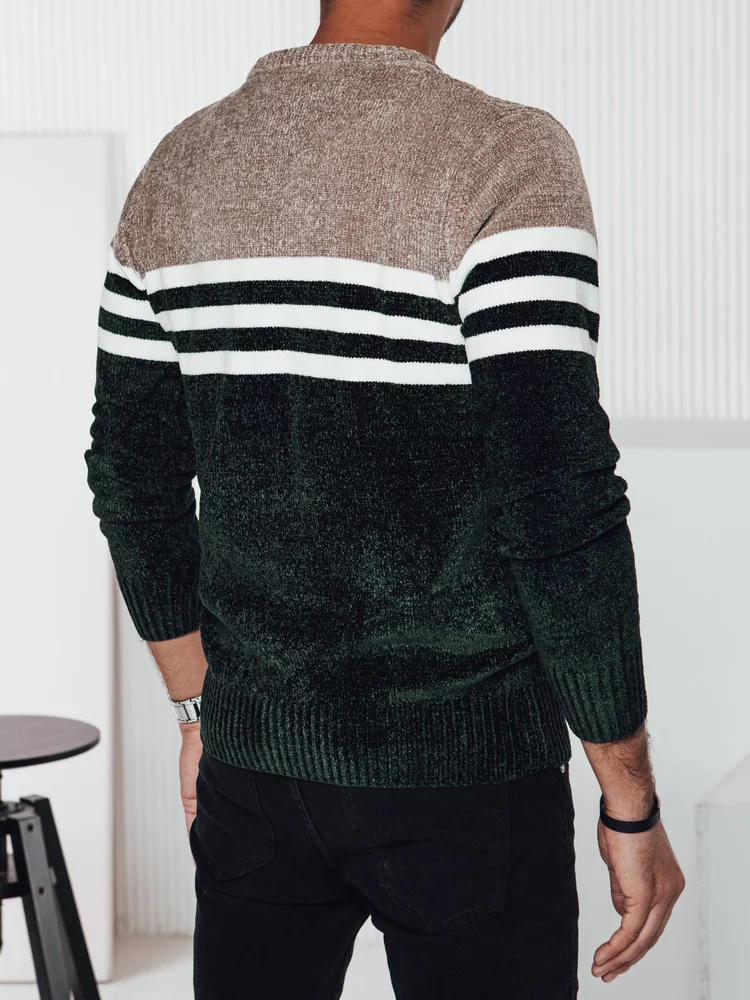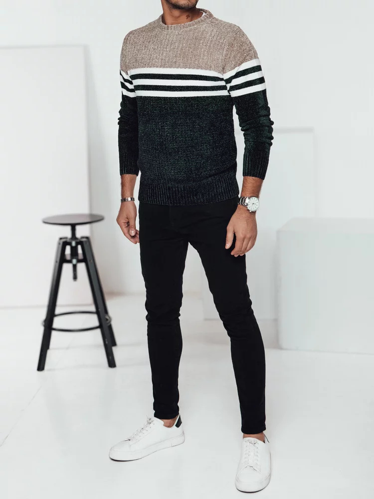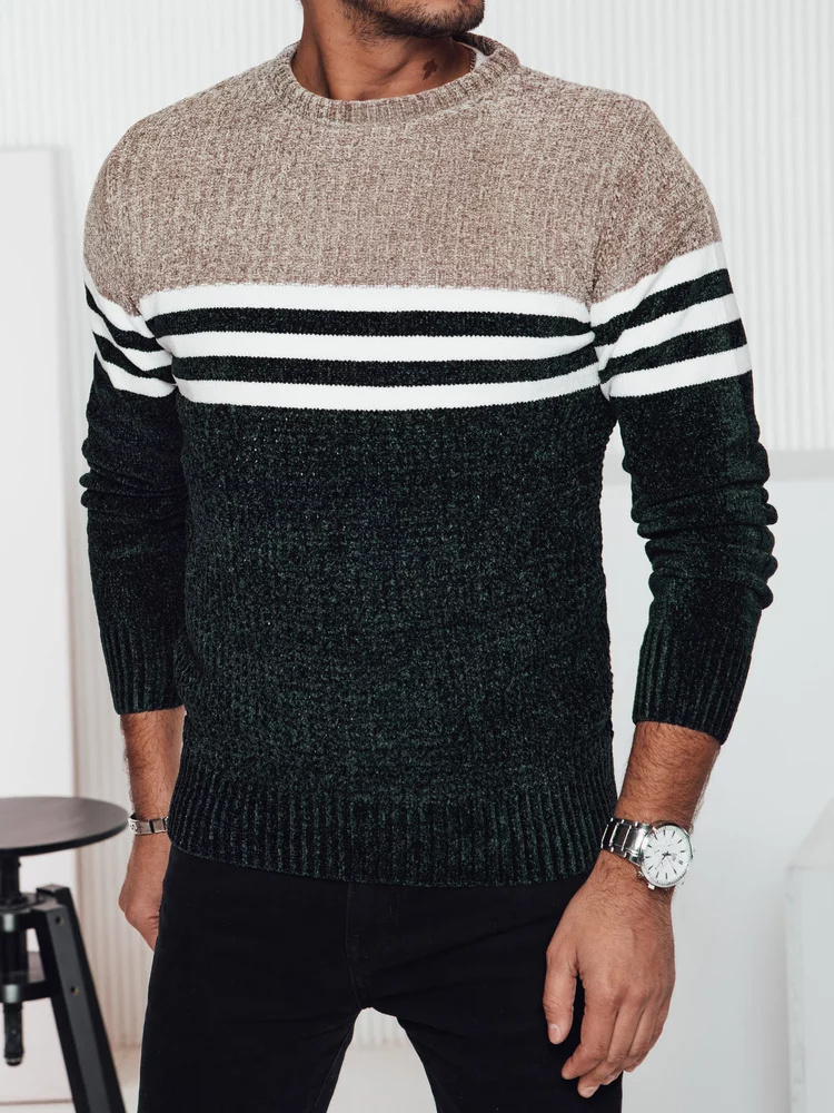 Teplý pánský svetr s výrazným pruhovaným vzorem, ideální na chladnější dny.